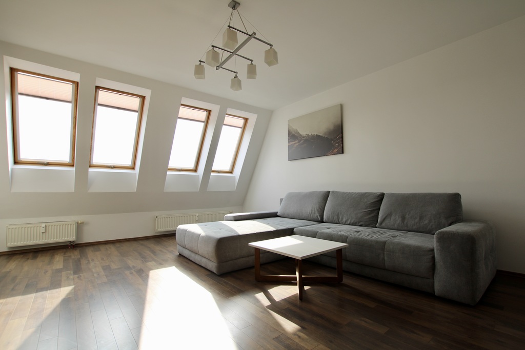 Na pierwszym poziomie znajduje się duży, jasny salon połączony z nowoczesną kuchnią i jadalnią, a także jedna z dwóch łazienek. Mieszkanie jest w pełni umeblowane i gotowe do zamieszkania. Wysoki standard wykończenia zapewnia komfort i wygodę przyszłym właścicielom.