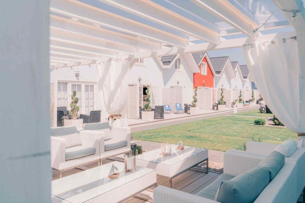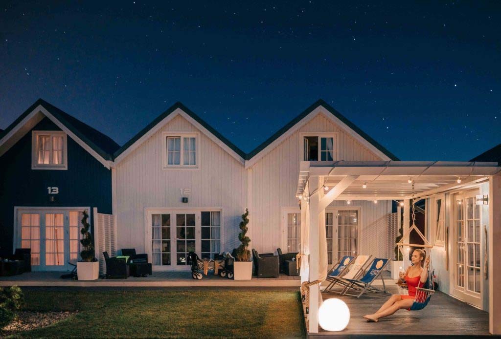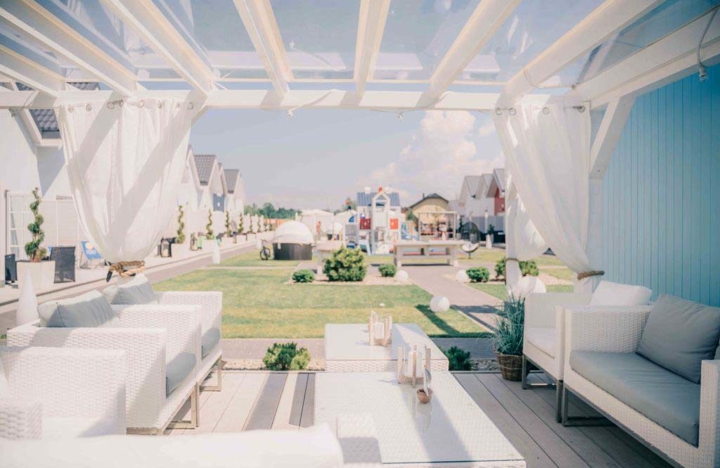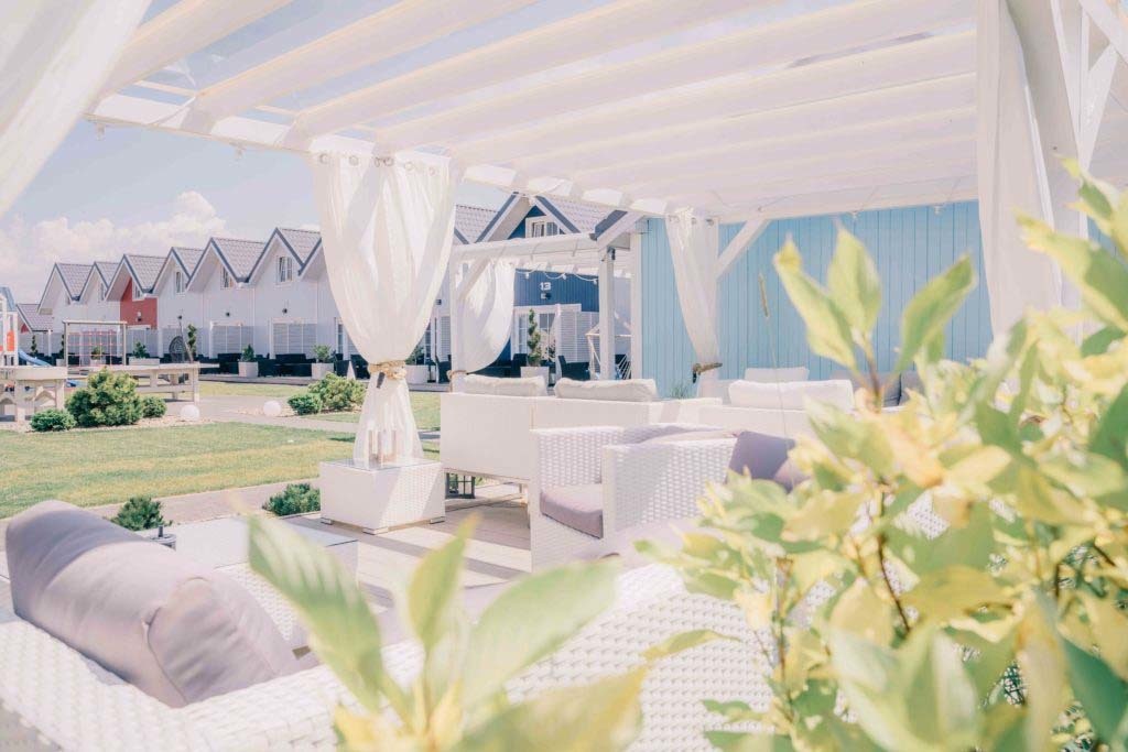 Przed domkami znajdują się tarasy wyposażone w stoliki i miejsca do siedzenia. Do użytku są też leżaki i parawany plażowe. W domku maksymalnie może mieszkać 8 osób. Na terenie ośrodka znajduje się basen 50 m2, plac zabaw, zadaszone altanki i kamienne grille oraz węglowe.