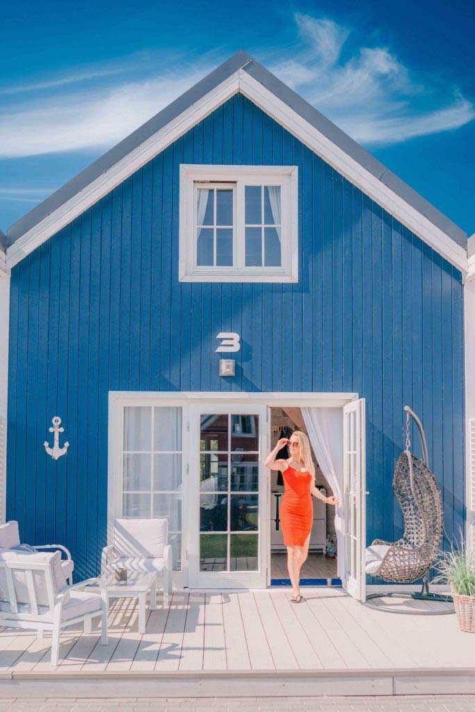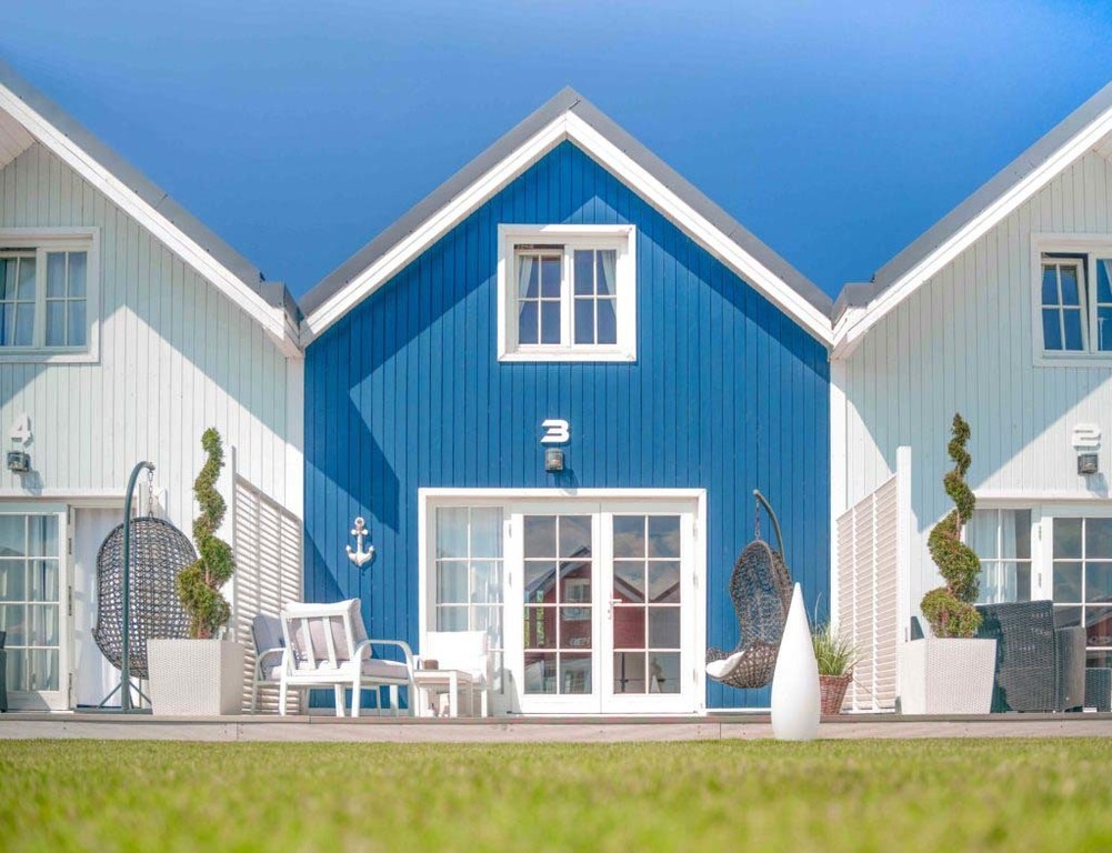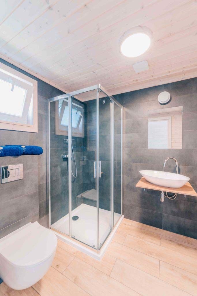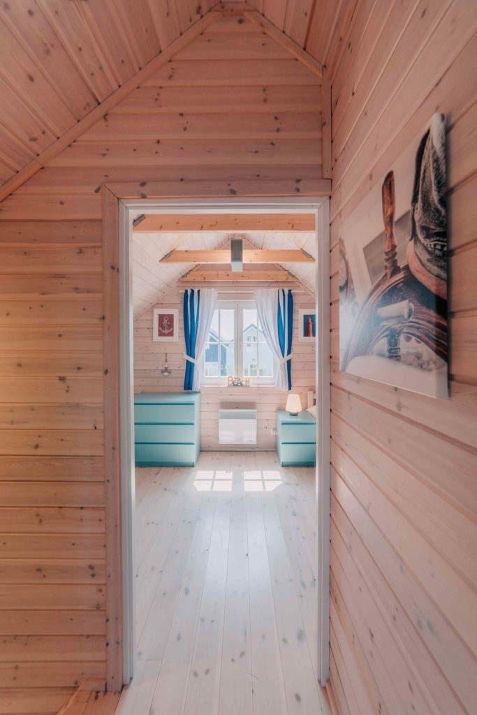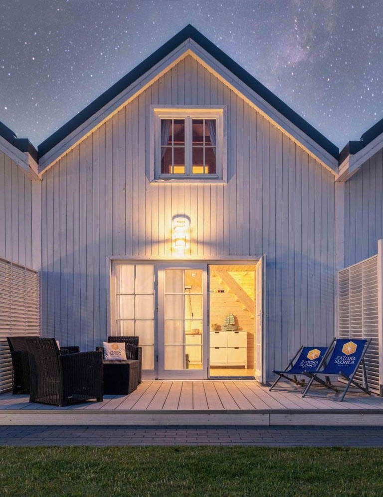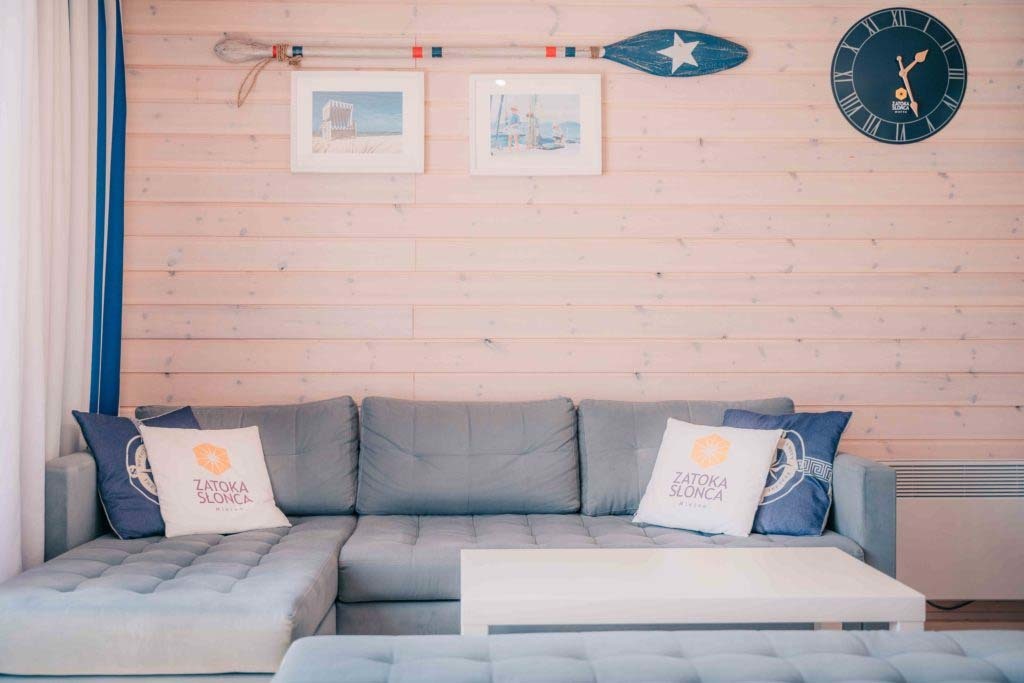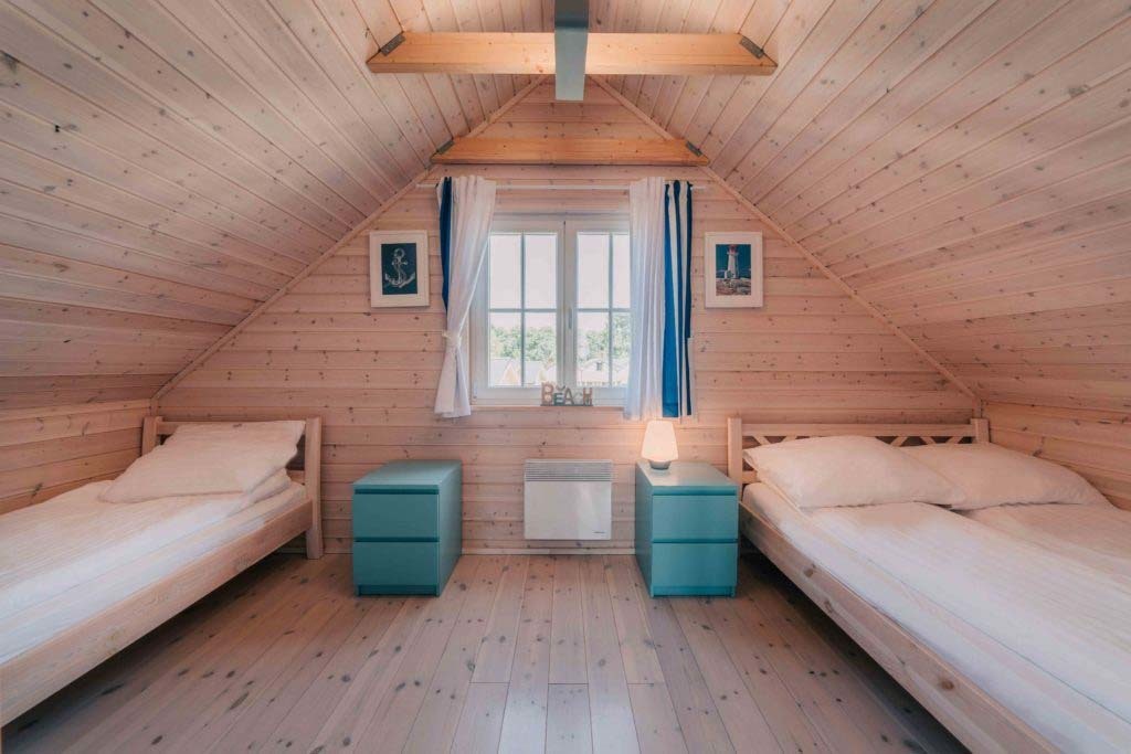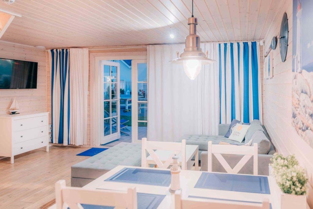 W każdym domku znajduje się kompletnie wyposażona kuchnia ze zmywarką, salon, dwie sypialnie oraz WC z łazienką.