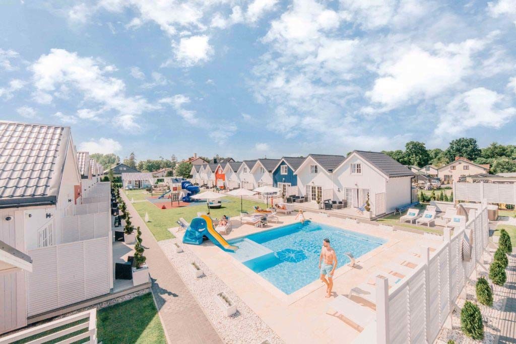 Położony 600 m od morza i 1200 metrów od jeziora Jamno, gdzie na powierzchni 3500 m² rozlokowanych jest 21 przytulnych, bogato wyposażonych domków o powierzchni 75 m² wraz z tarasem wypoczynkowym o powierzchni 15 m2.