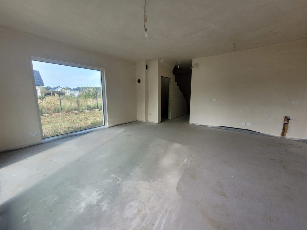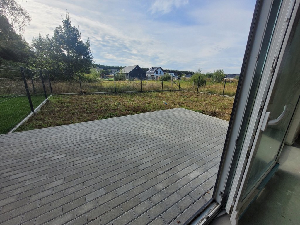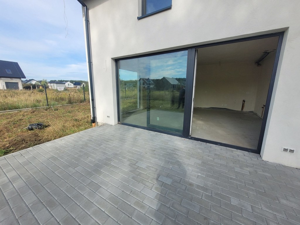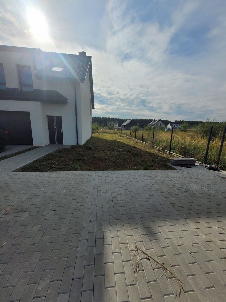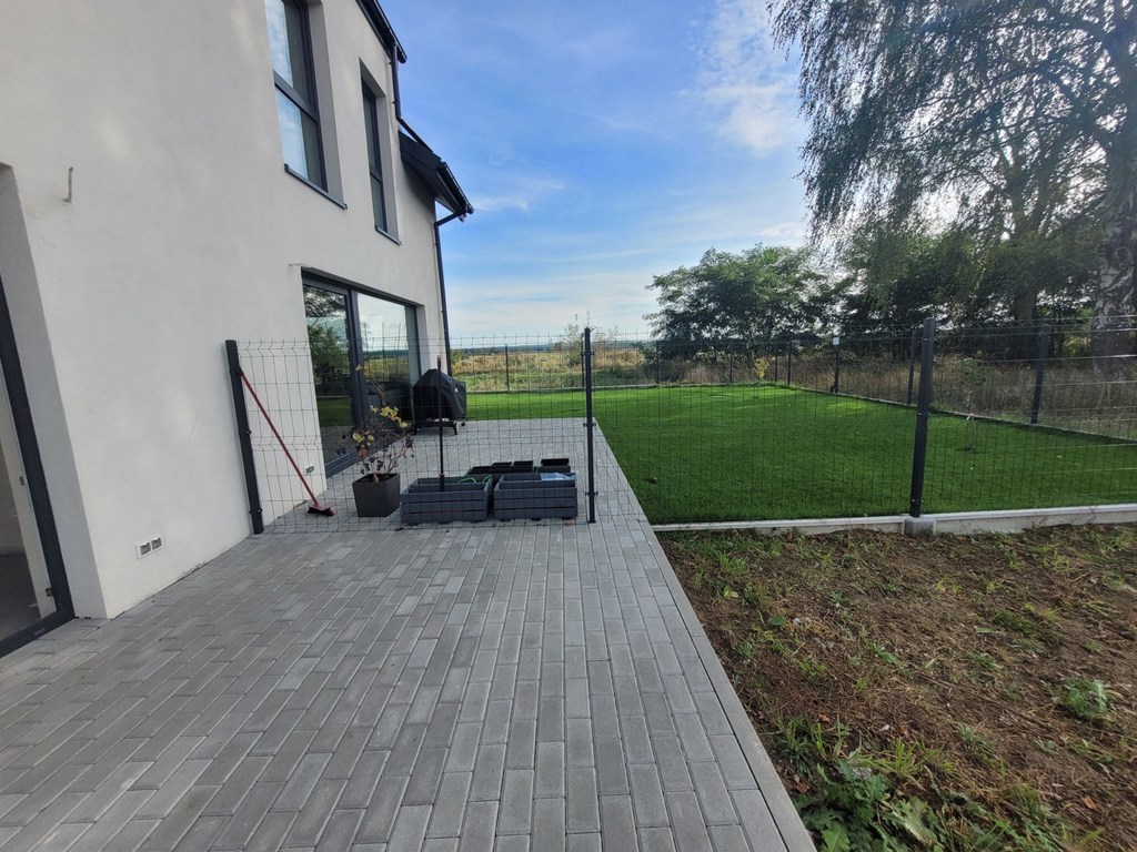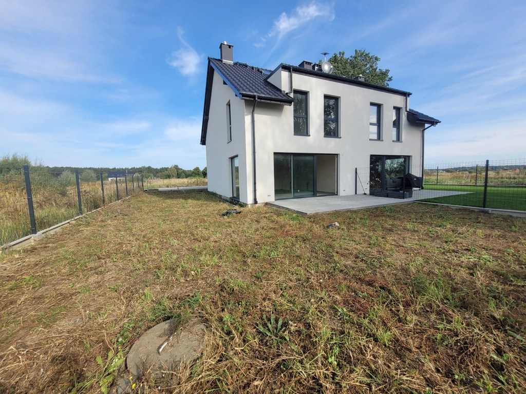 Dobra, okolice Szkoły Podstawowej. Połowa domu w zabudowie bliźniaczej o powierzchni użytkowej 108 m2, całkowitej 124 m2. Dom ma dwa poziomy i poddasze nieużytkowe. Parter budynku o pow. 56 m2, na którym znajduje się salon z aneksem kuchennym o łącznej powierzchni 30 m2, garaż 17 m2 z bramą otwieraną elektrycznie i wejściem z wiatrołapu. W salonie miejsce na kominek z wyprowadzeniem do komina. Drzwi tarasowe przesuwne. Okna PCV trzyszybowe. Ponadto pomieszczenie WC. Na piętro prowadzą schody wylewane. Na piętrze 3 sypialnie o powierzchni 12,5 m2, 9,5 m2 i 6,56 m2, przy czym tylko najmniejsza ma niewielki skos oraz garderoba o pow. 3,13 m2 z oknem połaciowym i niewielkim skosem. Łazienka o pow. 8,66 m2 z zamontowanym piecem gazowym dwufunkcyjnym. Ogrzewanie podłogowe na obydwu poziomach. Na stryszek prowadza schody drewniane rozkładane z klapą sufitowa. Dach ocieplony wełną mineralną. Kontakty elektryczne zamontowane, rozprowadzone instalacje TV, alarmowa itp. Budynek ocieplony z ładną jasna elewacja, dach pokryty dachówka ceramiczną. Taras i front budynku wyłożony kostką polbrukową. Działka z trzech stron ogrodzona. Piękna, cicha lokalizacja wśród zieleni. Polecam.