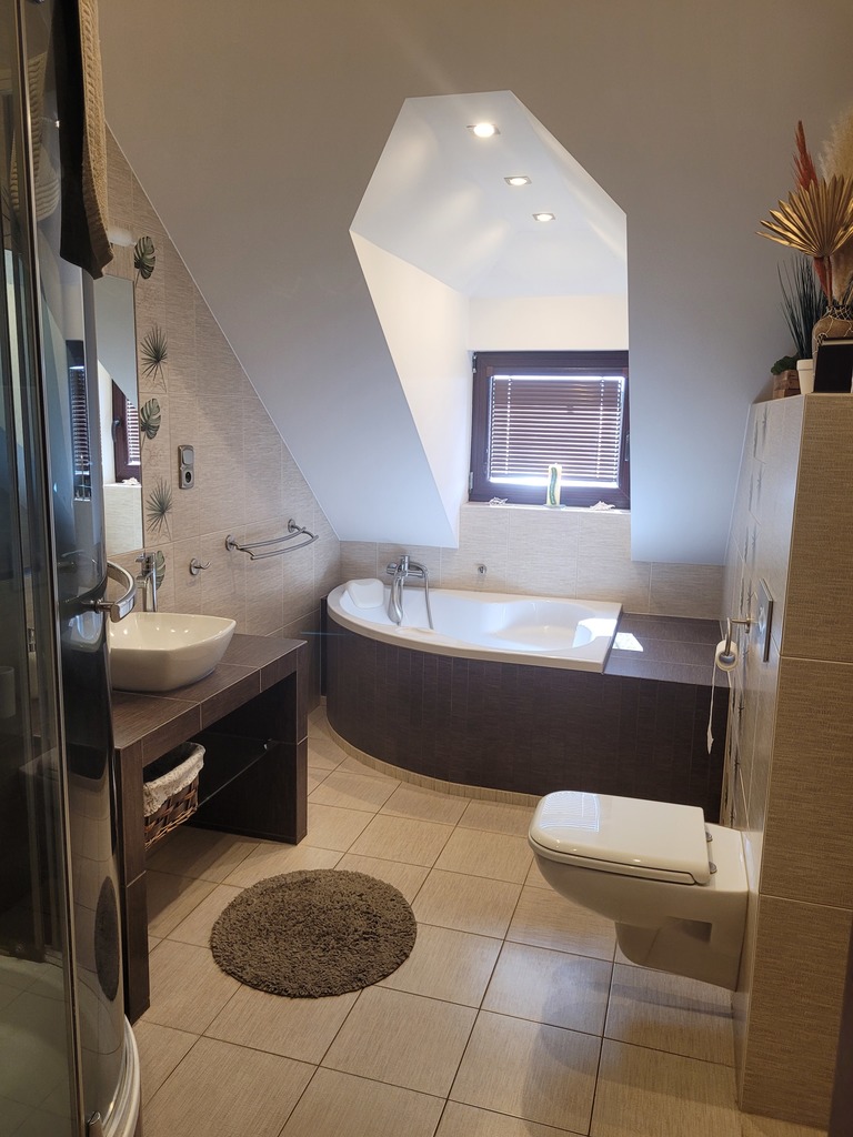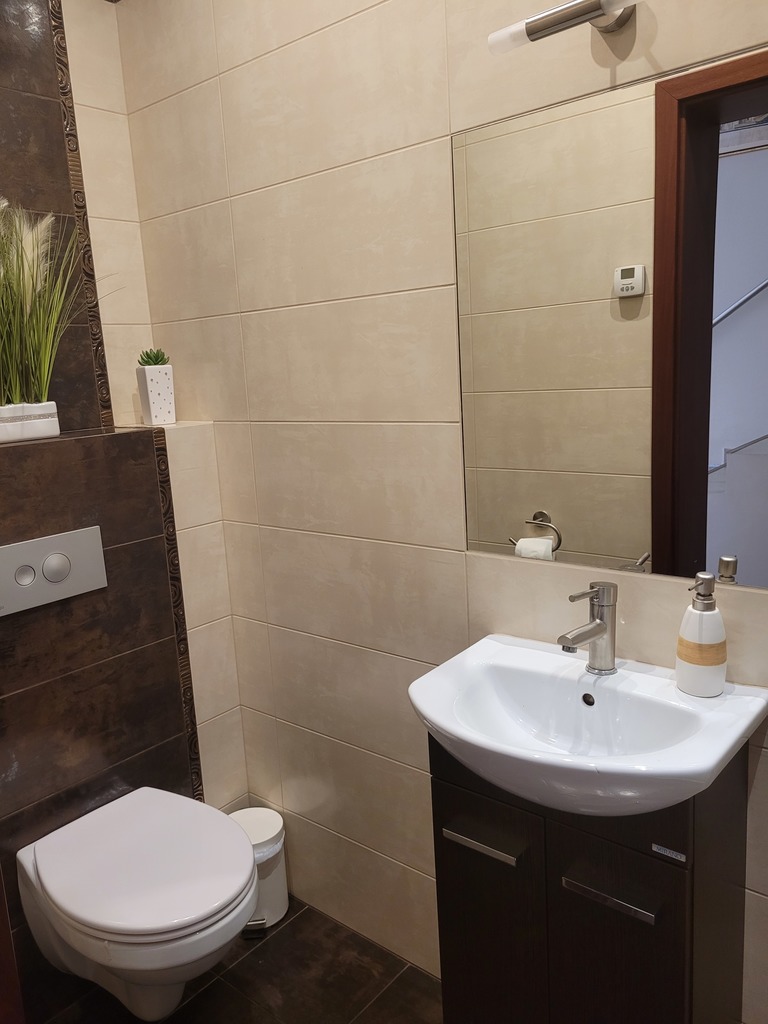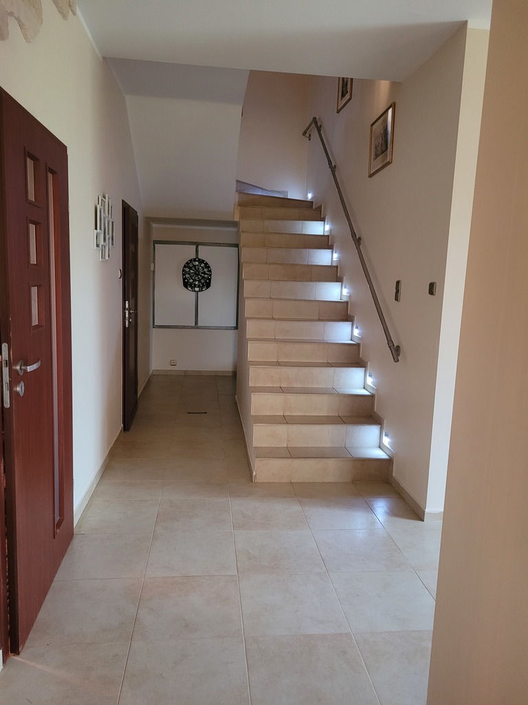 Poszczególne pokoje - sypialnie, posiadają urządzone łazienki, wykończone w glazurze i terakocie wraz z garderobami. Okna pcv, balkon na piętrze.