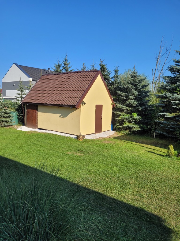 Ogród z licznymi nasadzeniami ozdobną zielenią. Znajduje się domek gospodarczy, miejsca przygotowane do wypoczynku i rekreacji.