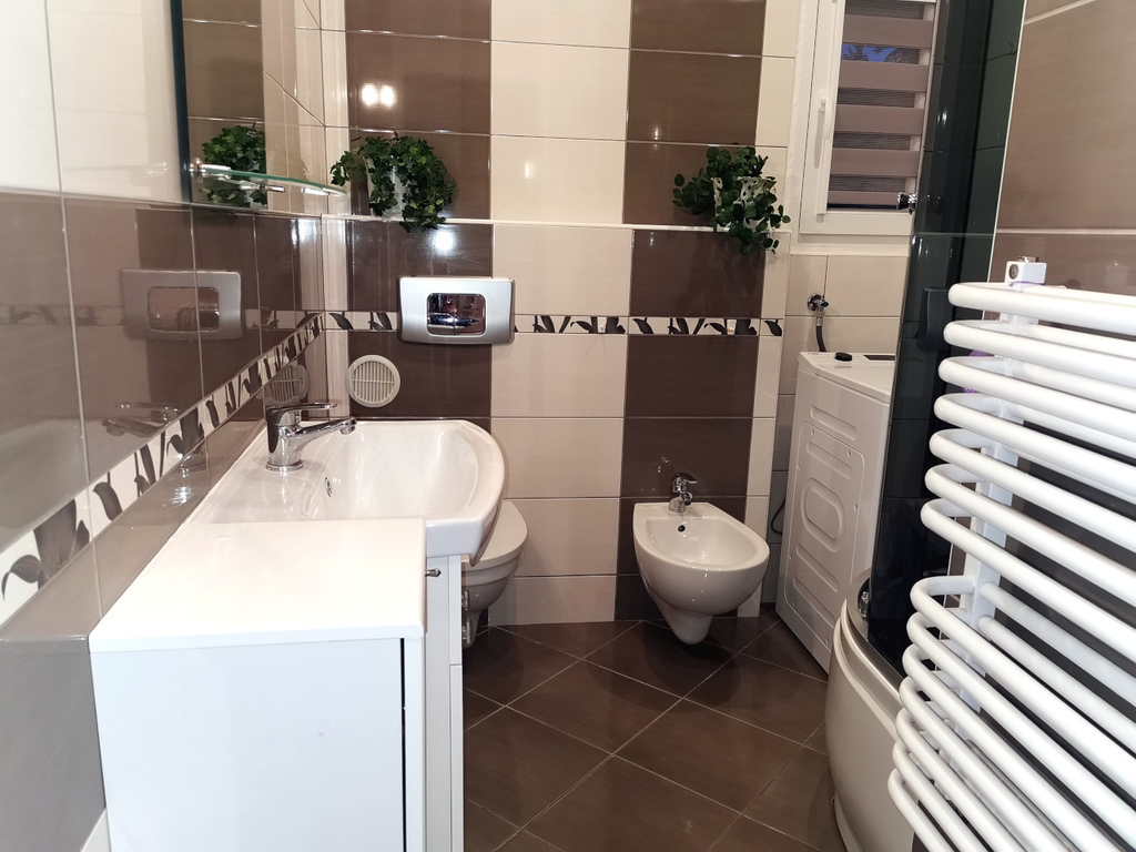 Łazienka z wc po remoncie - toaleta, bidet, prysznic, umywalka, pralka.