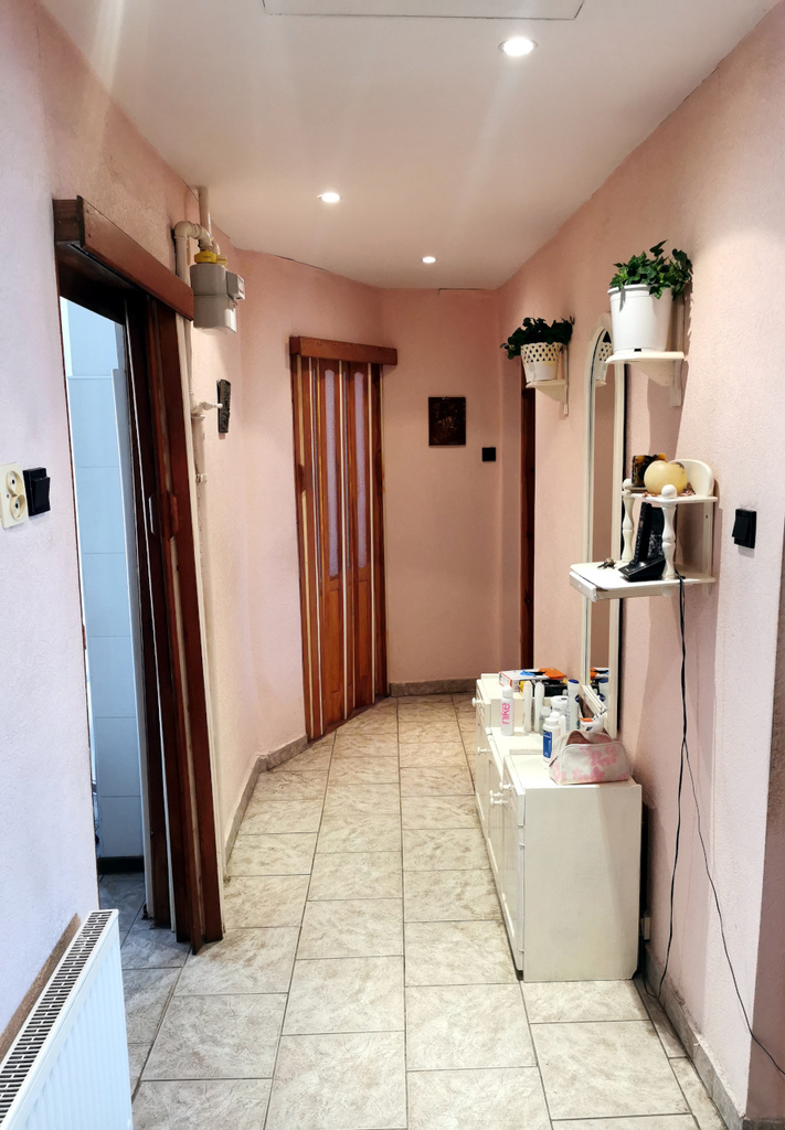 W przedpokoju na podłodze kafelki, sufit podwieszany z punktowym oświetleniem.