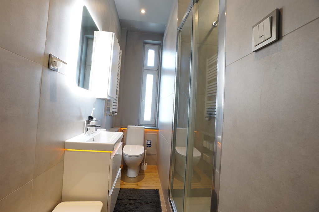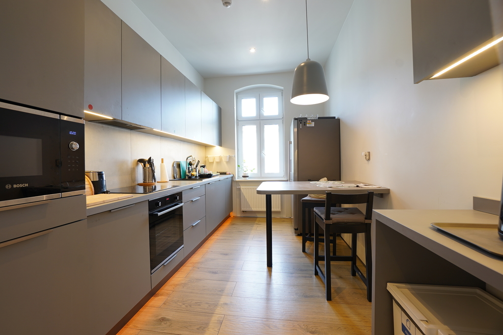 Na sprzedaż mieszkanie w odrestaurowanej kamienicy znajdujące się na trzecim piętrze. Lokal przeszedł przebudowę i aktualnie składa się z trzech pokoi, kuchni, dwóch łazienek, dwóch korytarzy i przedpokoju. Mieszkanie w Księdze Wieczystej ma 73,10 m2, po przebudowie mieszkanie posiada powierzchnię 70,43 m2. Lokal posiada wygładzone i pomalowane ściany oraz wykładziny podłogowe na posadzce. W przedpokoju deski sosnowe, polakierowane wraz z listwami przypodłogowymi w dobrym stanie użytkowym. W całym mieszkaniu okna plastikowe pcv. Lokal posiada instalację elektryczną, gazową, wod-kan, domofonową, alarm, monitoring. W pomieszczeniach grzejniki stalowe. W pobliżu deptak Bogusława, restauracje, cukiernie, piekarnie, siłownia, CH Kupiec oraz komunikacja miejska.