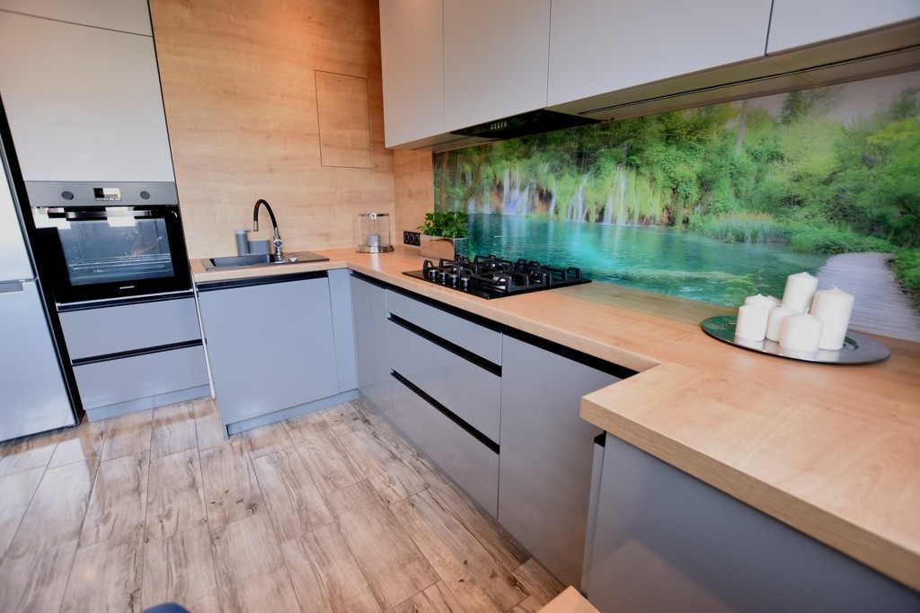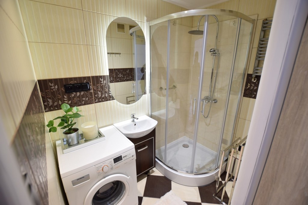 Standard mieszkania: ściany gładzone /malowane, na podłogach panele i terrakota, kuchnia w zabudowie z meblami na wymiar, łazienka i WC w kaflach.