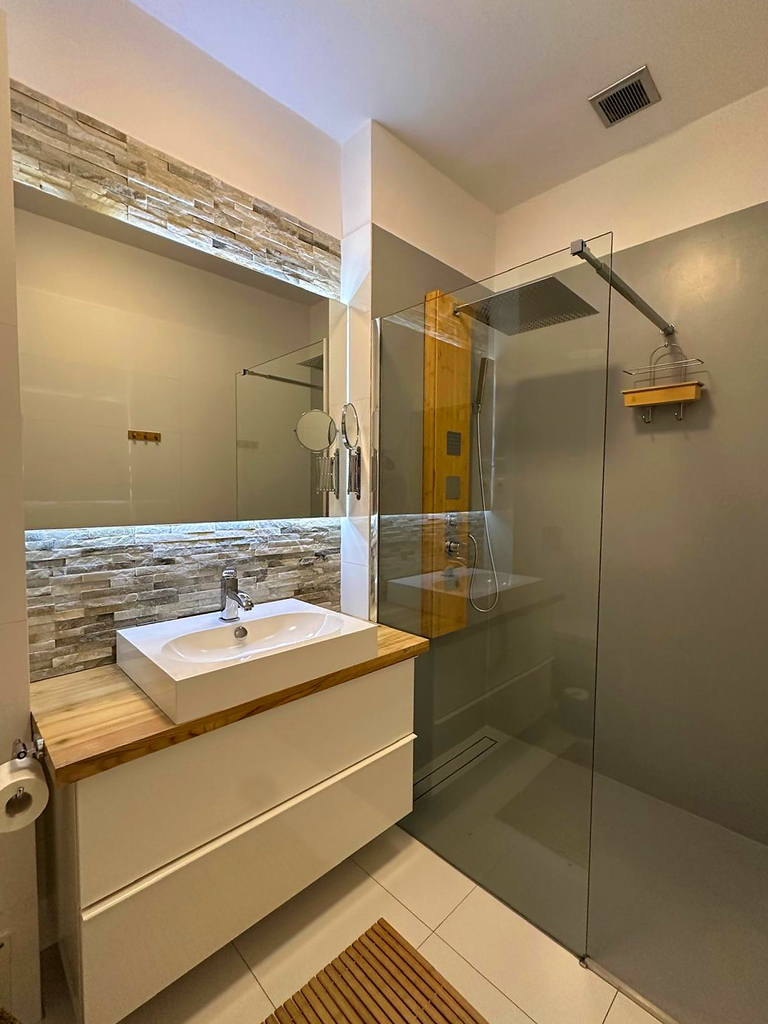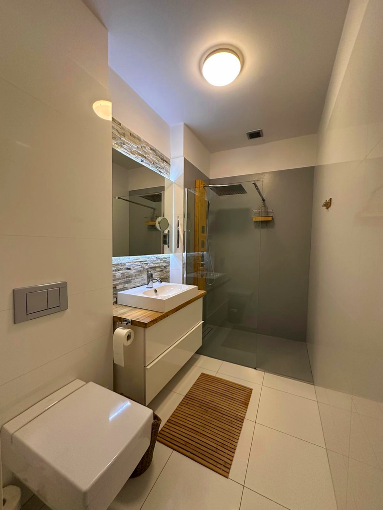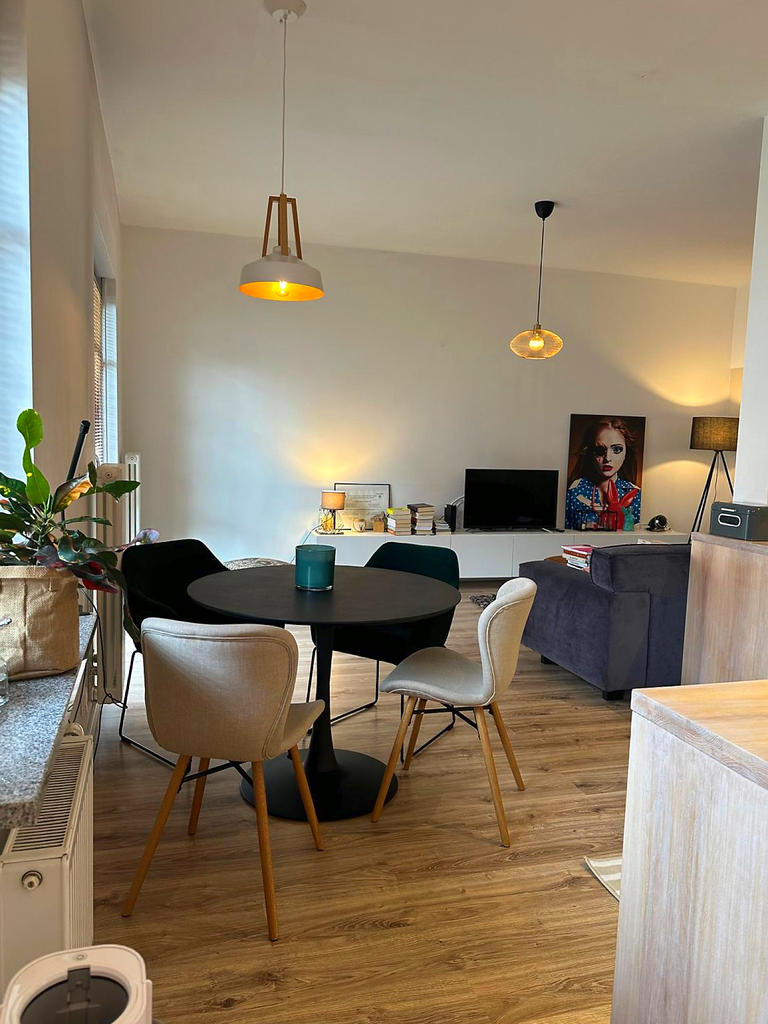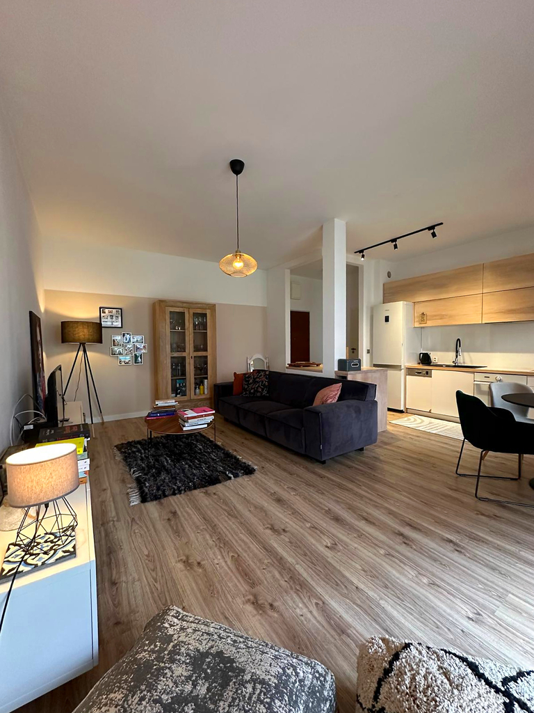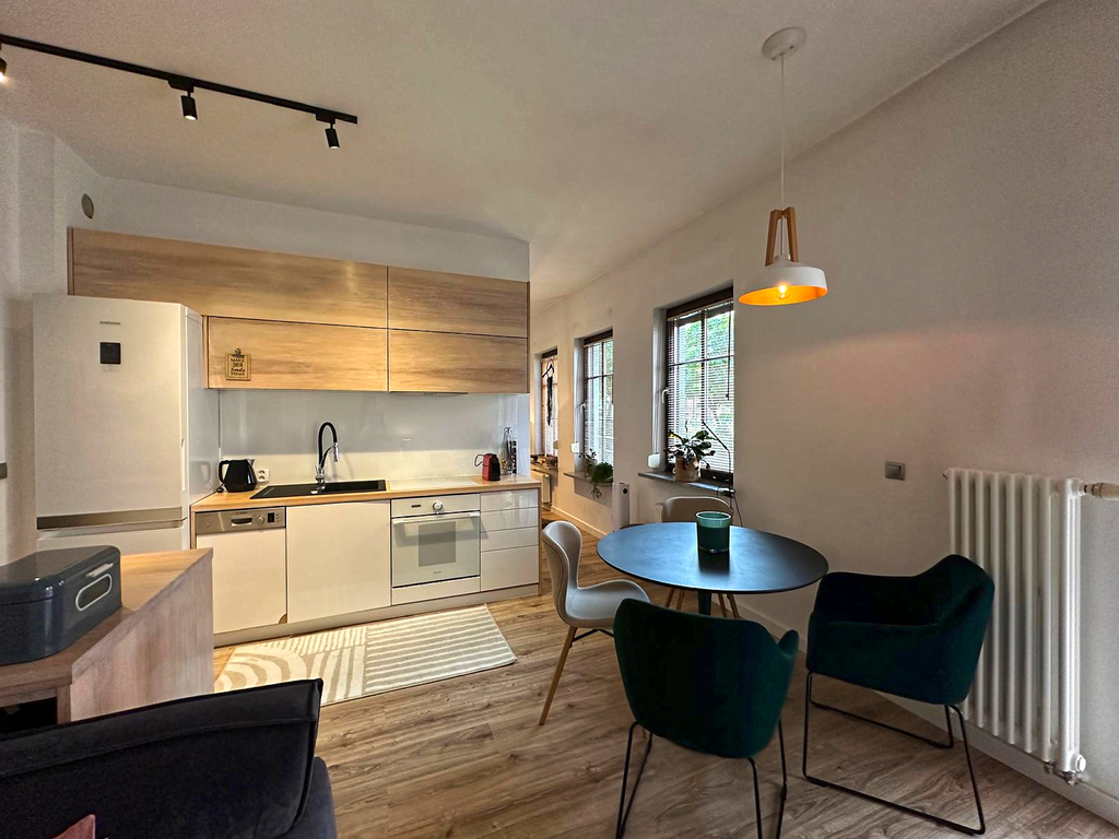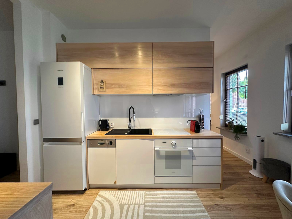 Mieszkanie urządzone zostało bardzo gustownie z użyciem materiałów wysokiej jakości. Duży salon połączony z aneksem kuchennym z którego prowadzi wyjście na niewielki ogród wykończony polbrukiem. Meble kuchenne w zabudowie wraz ze sprzętem AGD (płyta indukcyjna, lodówka, zmywarka, piekarnik) oraz bardzo praktyczna w użyciu wyspa oddzielająca tym samym kuchnię od części salonowej. W pokojach oraz korytarzu na podłogach panele, w łazience kafle gresowe. Łazienka wyposażona w duży prysznic z odpływem liniowym, umywalkę, WC, grzejnik oraz duże podświetlane lustro. W łazience ogrzewanie podłogowe. Sypialnia otwarta, na wyposażeniu duża szafa w zabudowie firmy Komandor.