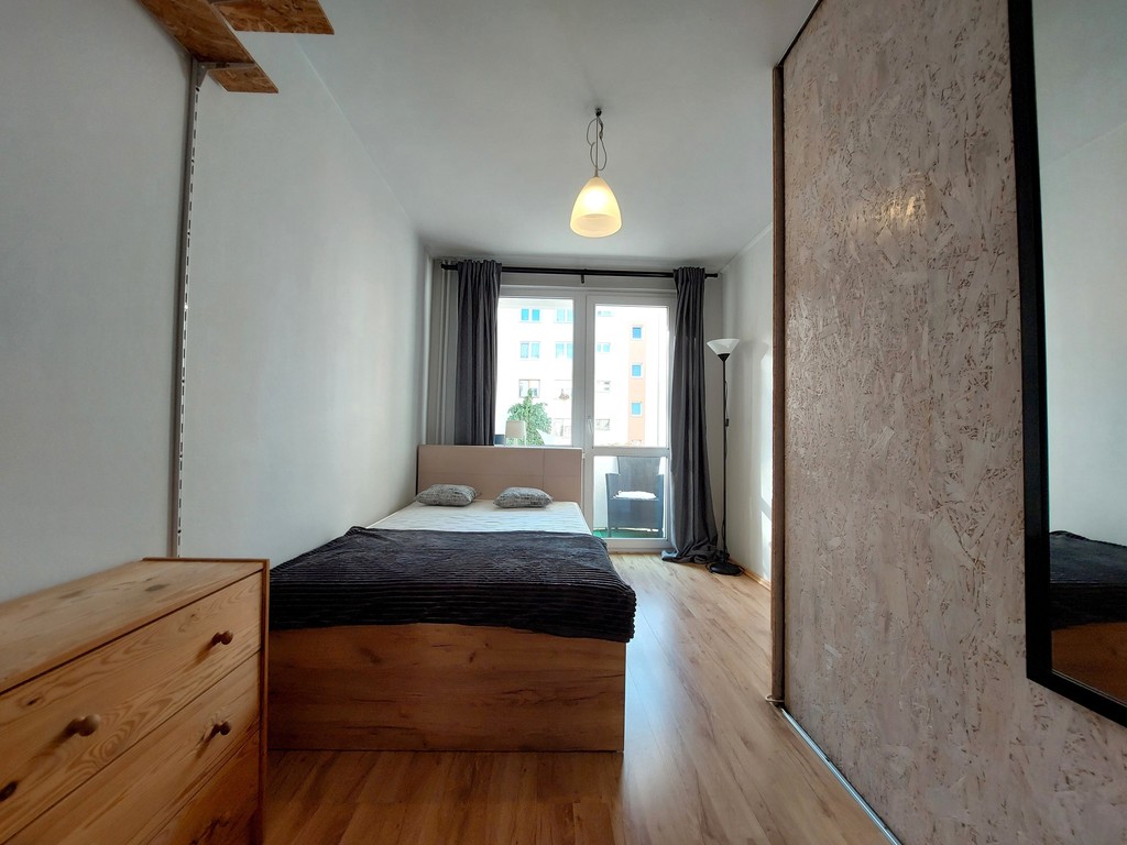 Z salonu jest wejście do sypialni z balkonem i dużą szafą.