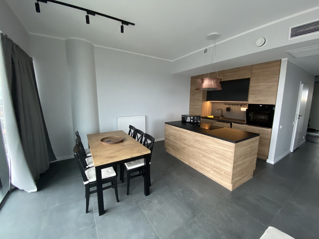 Przestronny salon z aneksem kuchennym o powierzchni 41m², z nowoczesną, w pełni wyposażoną kuchnią na wymiar oraz eleganckimi meblami. Spektakularne oszklenie dające niesamowity widok na panoramę Szczecina.