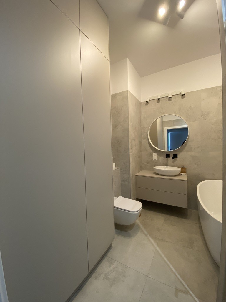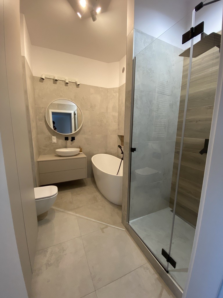 Łazienka o powierzchni 6m², wyposażona w wannę, kabinę prysznicową, WC oraz pralkę w zabudowie na wymiar