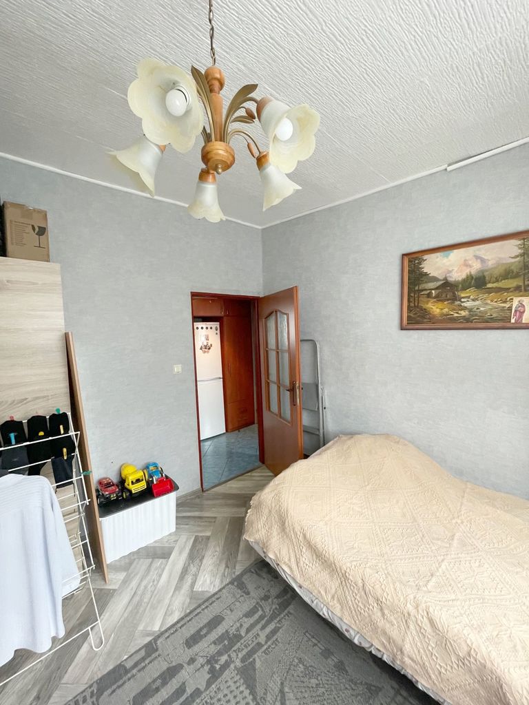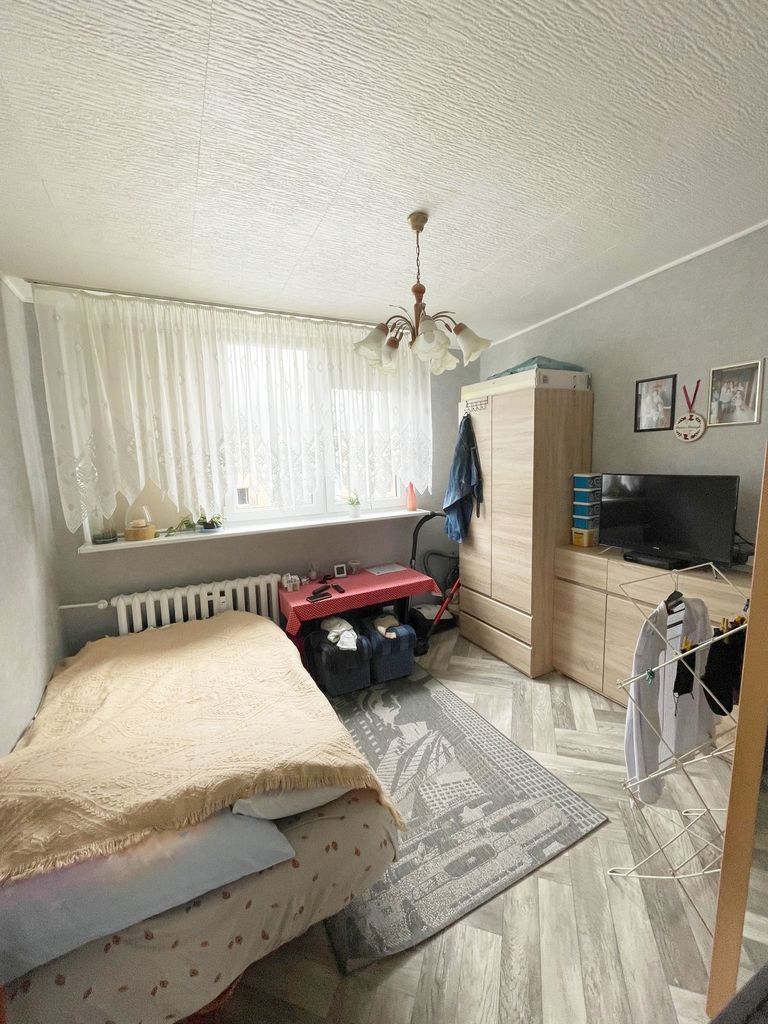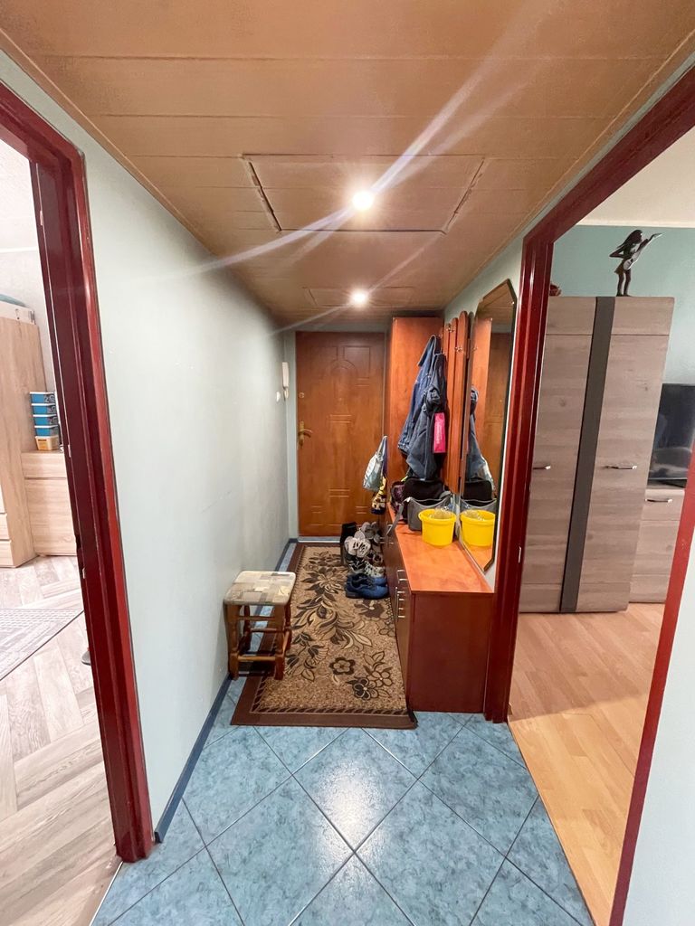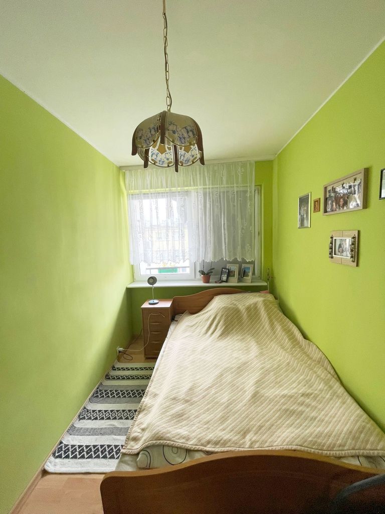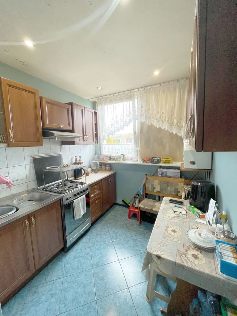 Ekspozycja mieszkania wschodnio -zachodnia. Na podłodze w 2 pokojach panele, w pozostałym pokoju na podłodze linoleum. Ściany gładzone i pomalowane ( w jednym pokoju na ścianie tapeta). Kuchnia oddzielna z oknem z meblami kuchennymi i sprzętem AGD. Do mieszkania przynależy piwnica. Ogrzewanie i ciepła woda z sieci miejskiej. Czynsz przy 2 osobach ok. 800 zł. W pobliżu sklepy, szkoła, przedszkole, szpital, przychodnia, blisko do komunikacji miejskiej.