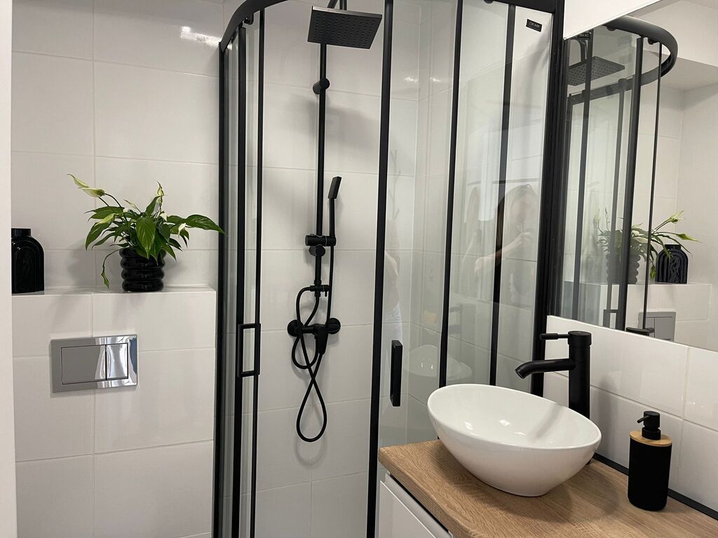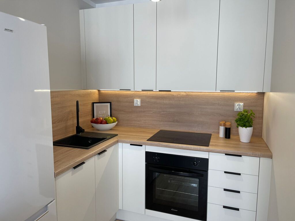 Ściany zostały zagruntowane i pomalowane. W mieszkaniu wylano nowe posadzki na których położono panele AC4 EGGER. Drzwi wewnętrzne DRE. Meble kuchenne montowane na wymiar wraz ze sprzętami AGD(piekarnik, indukcja, lodówka ).