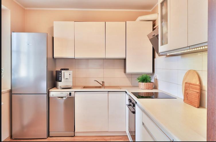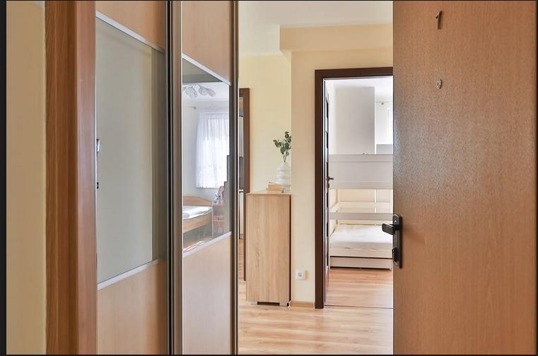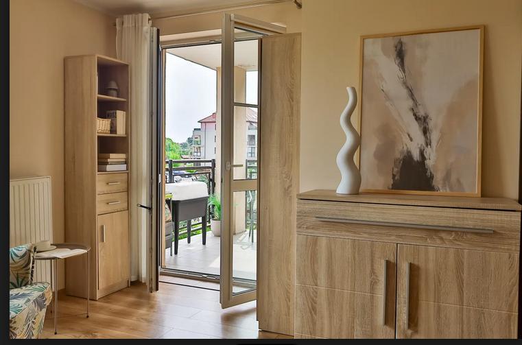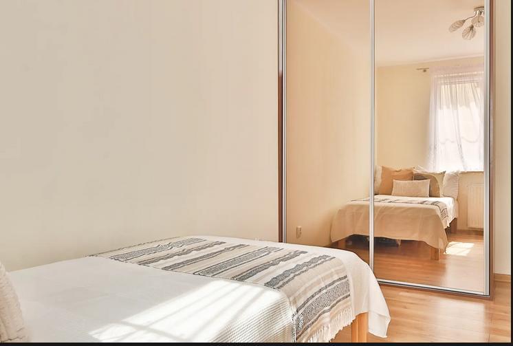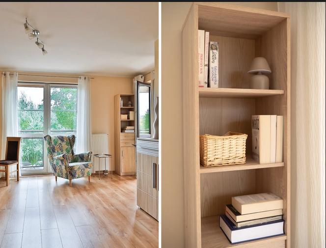 Kuchnia jest oddzielona od pokoju przesuwanymi drzwiami. W kuchni znajduje się meble kuchenne, lodówka, zmywarka, kuchenka elektryczna z piekarnikiem. W sypialni znajduje się łóżko oraz obszerna szafa ubraniowa.