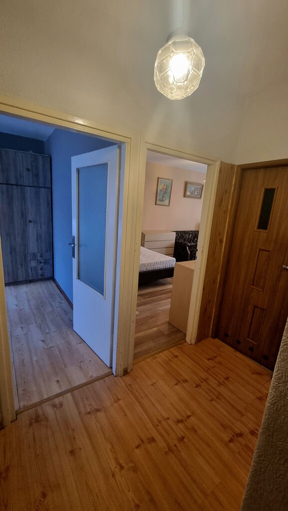 Z większego pokoju wyjście prowadzi na duży balkon, z którego rozciąga się widok na centrum miasta. Wszystko to w otoczeniu skandynawsko-pastelowych kolorów, które dodają wnętrzu ciepła i przytulności. W pokojach na wyposażeniu: salon - szafa, łóżko; sypialnia - łóżko, dwie komody. Duża, umeblowana kuchnia z oknem o powierzchni 9m2 wyposażona jest w niezbędny sprzęt AGD, co sprawia, że gotowanie staje się przyjemnością. Łazienka o powierzchni 4m2 wykończona glazurą i terakotą posiada kabinę prysznicową, a osobne WC zwiększa funkcjonalność mieszkania. Przedpokój również został zaprojektowany z myślą o praktycznym wykorzystaniu przestrzeni.