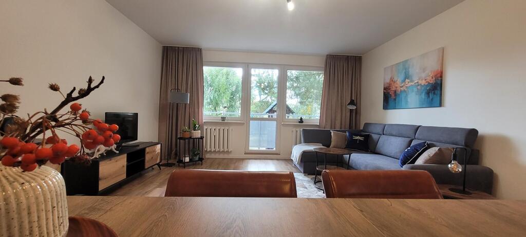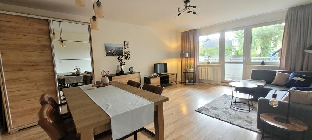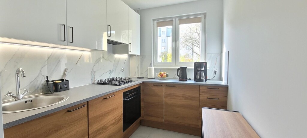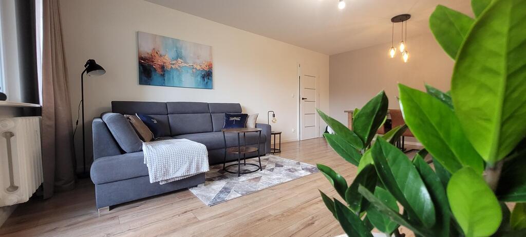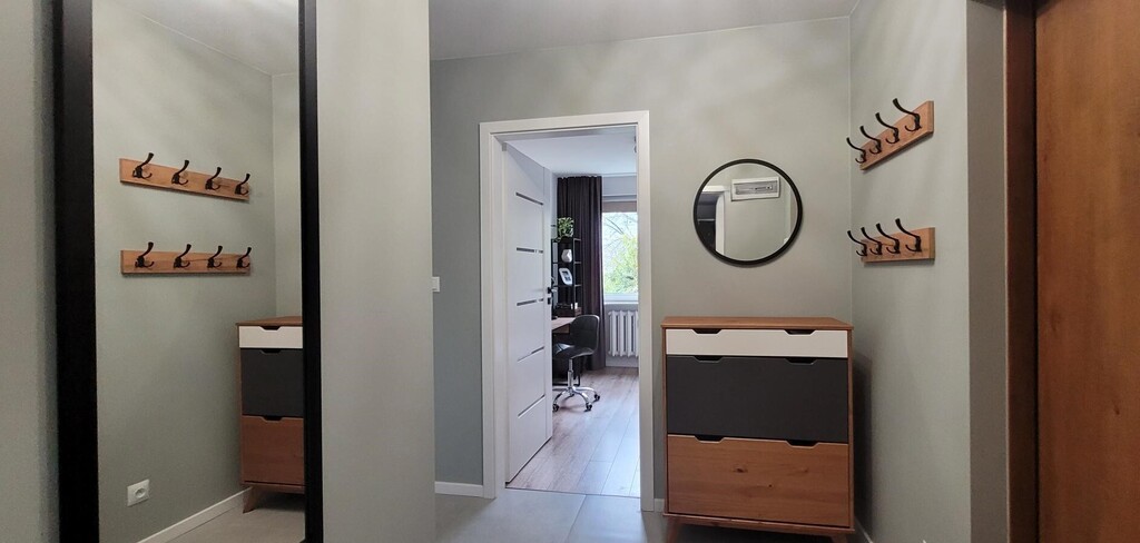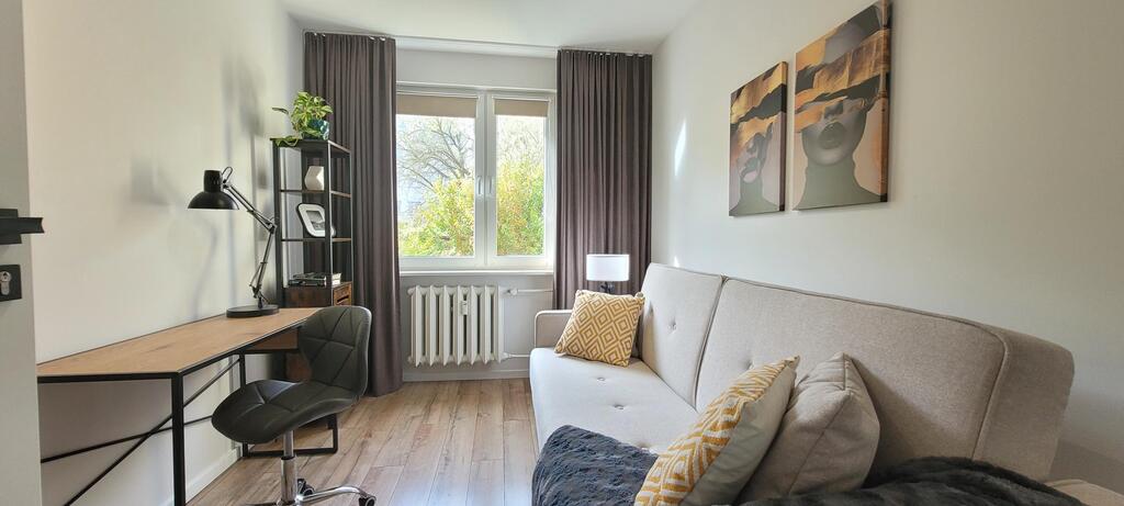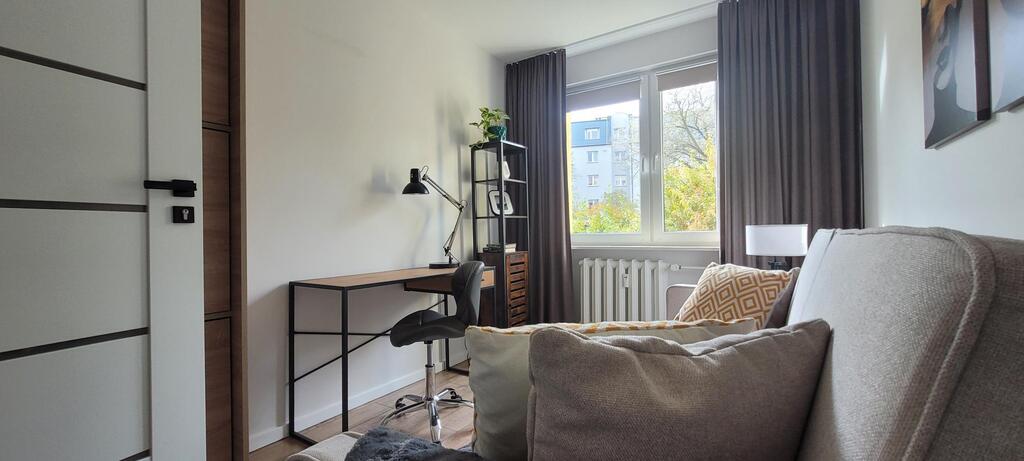 Mieszkanie po generalnym remoncie, na podłodze nowe panele i kafle, ściany pomalowane w neutralnych kolorach. W mieszkaniu zostały wymienione wszystkie meble oraz sprzęty AGD.