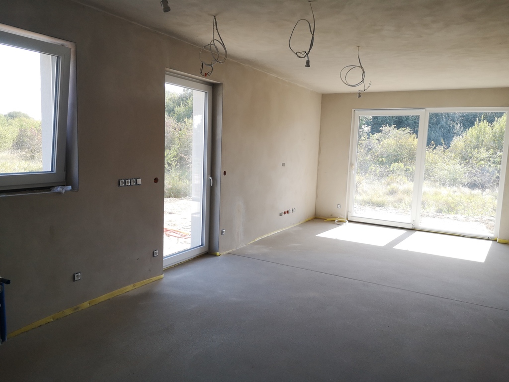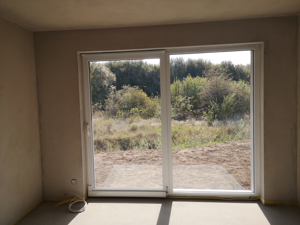 Budynek posadowiony jest na płycie fundamentowej dobrze izolowanej (25 cm XPS), zabezpieczonej przeciwwilgociowo, dookoła opaska drenażowa, ściany ocieplone 20 cm grafitowym styropianem, elewacja tynk barwiony w masie CAPAROLA, na dachu blacha na rąbek, rynny metalowe, okna PCV 3-szybowe( Salamander )z nawiewnikami, wentylacja grawitacyjna pomieszczeń, tarasy na izokorbach dobrze izolowane, barierki ze stali nierdzewnej.