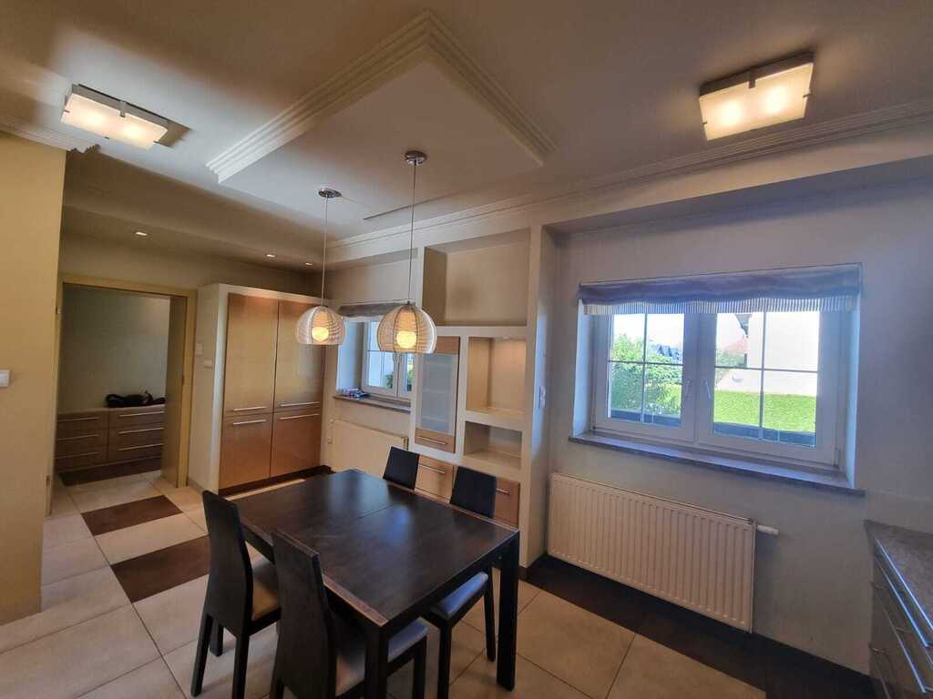 Ściany we wszystkich pokojach gładkie - malowane. Podłogi wykończone panelami, open wykładzina PCV. Łazienki wykończone ładną glazurą i terakotą. Okna w domu na parterze PCV, dachowe połaciowe - drewniane. Ogrzewanie i ciepła woda z pieca gazowego dwu obiegowego. Kanalizacja i ujęcie wody miejskie. Na piętro i do "open Space" na poddaszu prowadzą betonowe schody pokryte drewnem. Dach pokryty dachówką cementową.