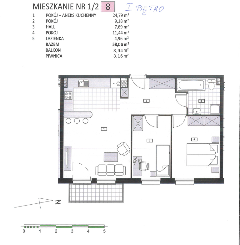 Przedmiotowe mieszkanie znajduje się na PIERWSZYM PIĘTRZE. Składa się z pokoju dziennego wraz z aneksem kuchennym łącznie o powierzchni 24,79mkw, pokoju o powierzchni 11,44mkw, pokoju 9,18mkw, łazienki 4,96mkw oraz hallu 7,69mkw. Do mieszkania przynależy balkon 3,94mkw oraz piwnica o powierzchni 3,16mkw.