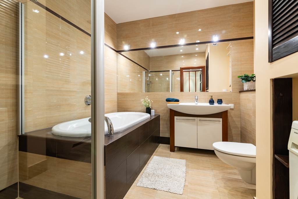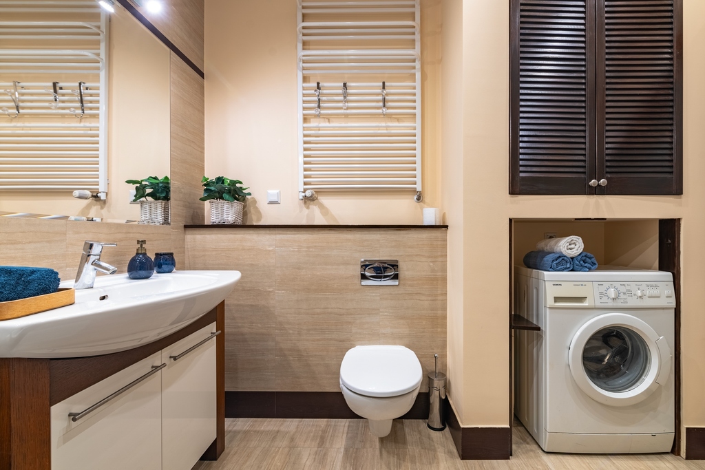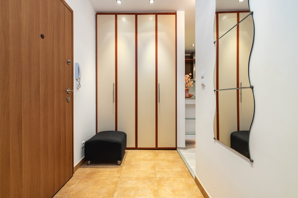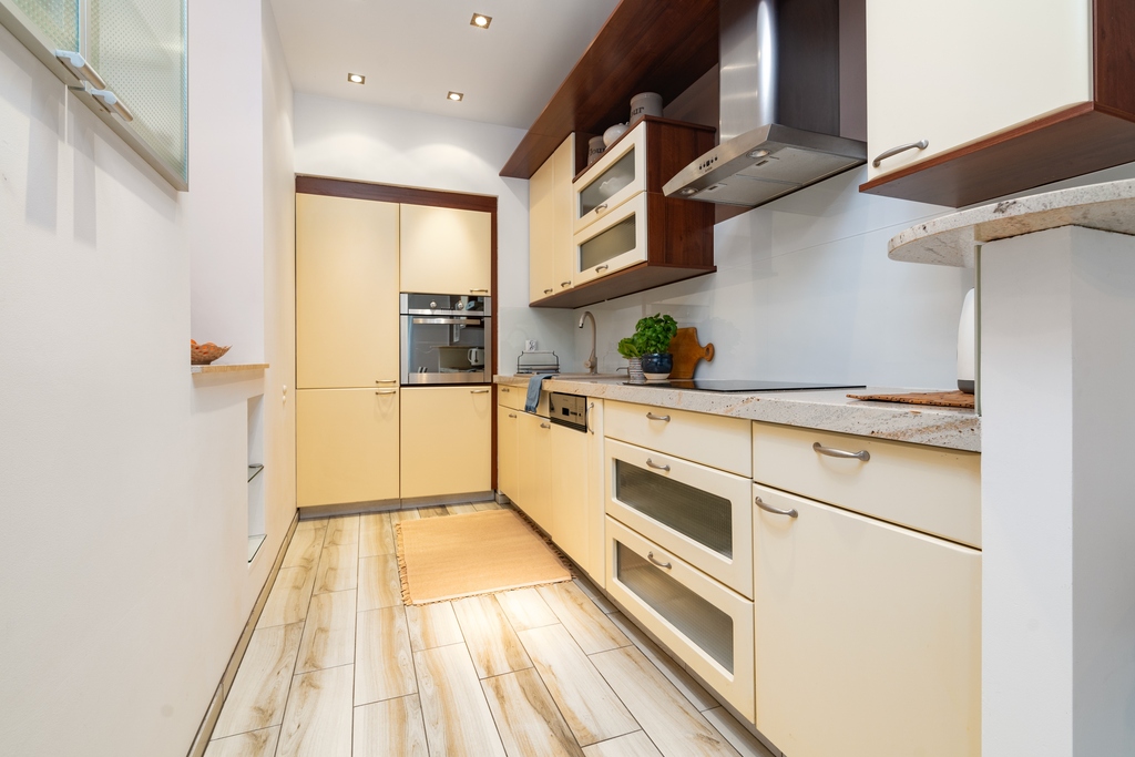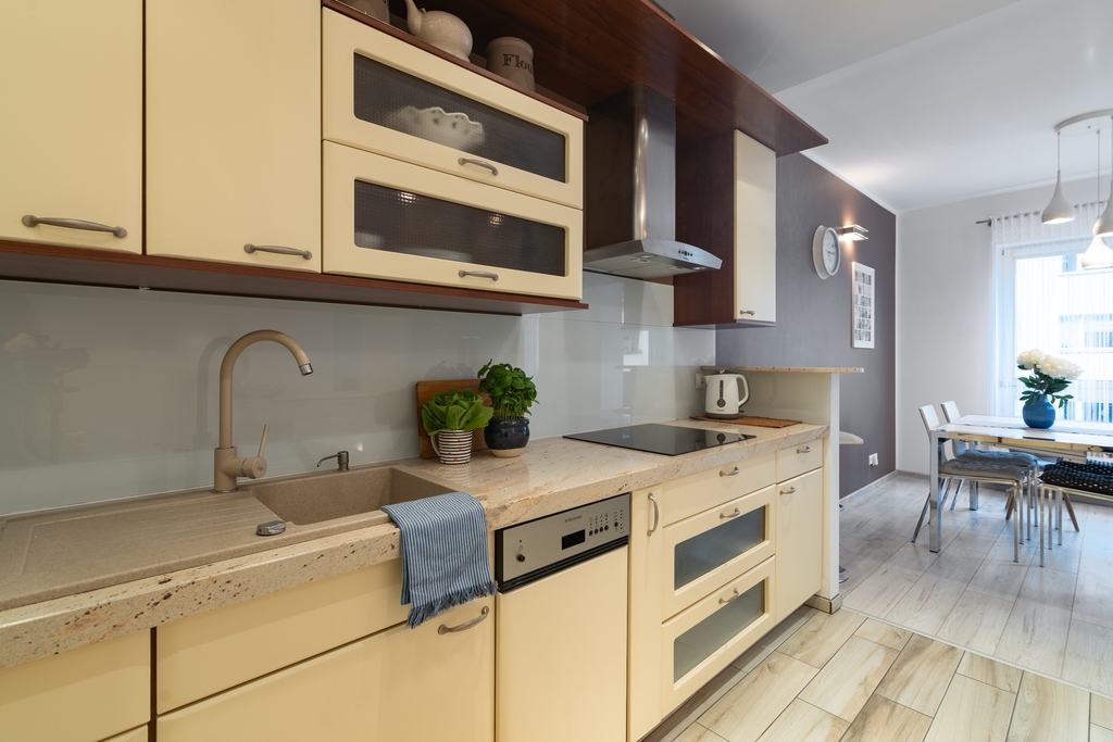 Mieszkanie jest kompletnie umeblowane i wyposażone w sprzęty AGD (lodówka z zamrażarką, piekarnik, płyta elektryczna, okap, zmywarka, pralka). Łazienka została wykończona w ładnych kaflach, z dużą wanną oraz kabiną prysznicową. W przedpokoju i sypialni znajdują się duże szafy na wymiar.