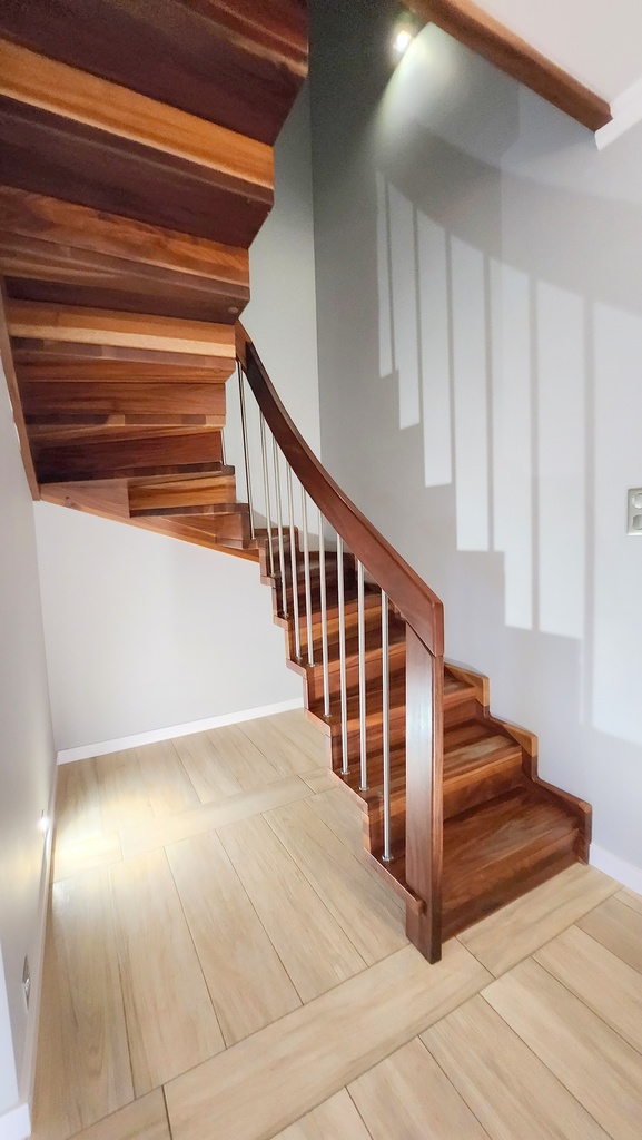 Schody na piętro oraz podłogi na piętrze z drewna egzotycznego.