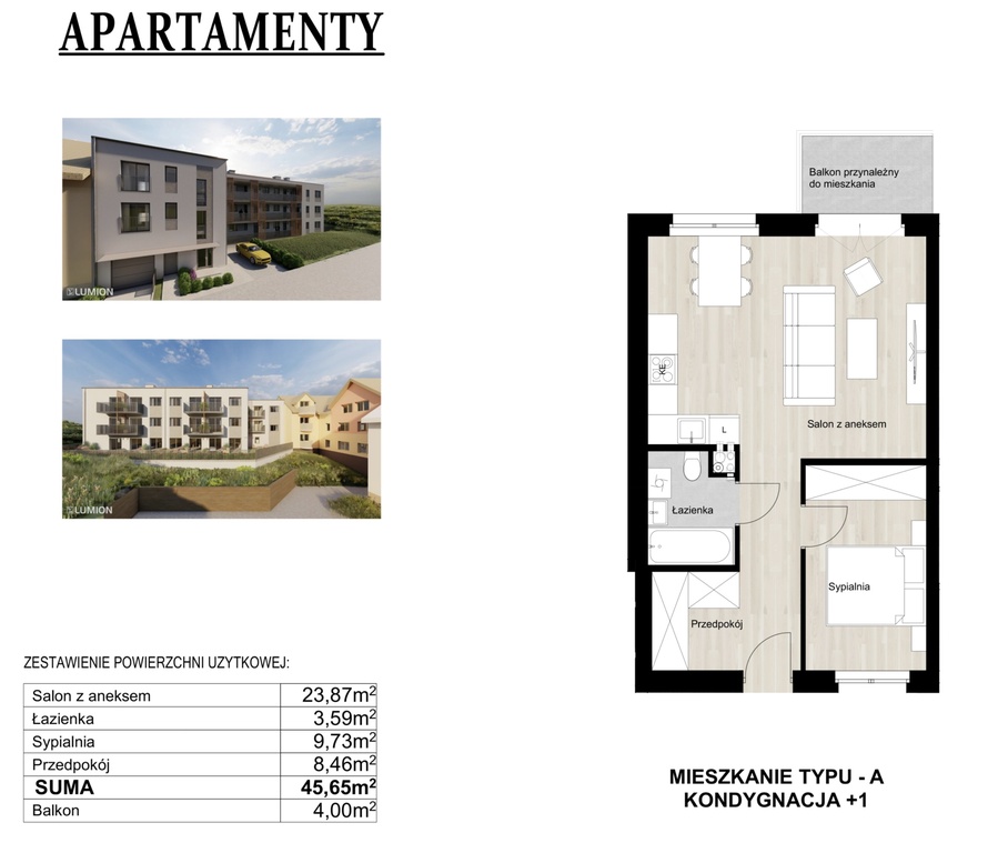Na sprzedaż nowe, 2 pokojowe mieszkanie o powierzchni 45.65 m2, zlokalizowane na pierwszym piętrze.