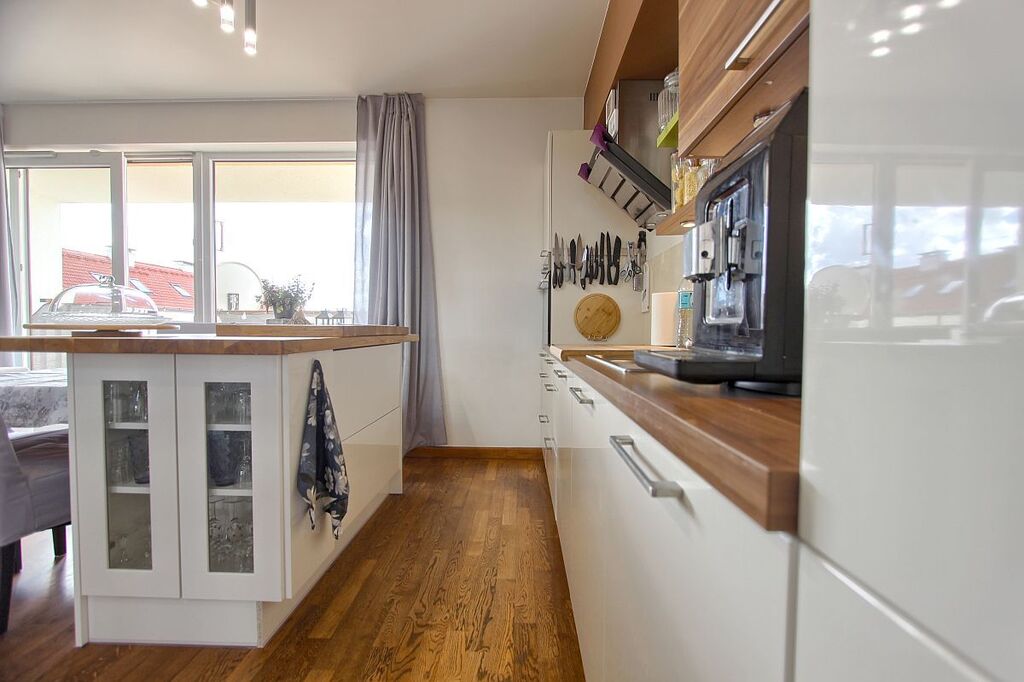 W korytarzu oraz sypialni szafy w zabudowie, kuchnia z meblami w zabudowie oraz z wyspą.