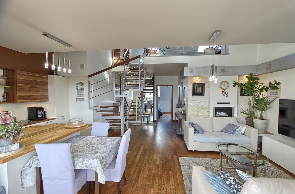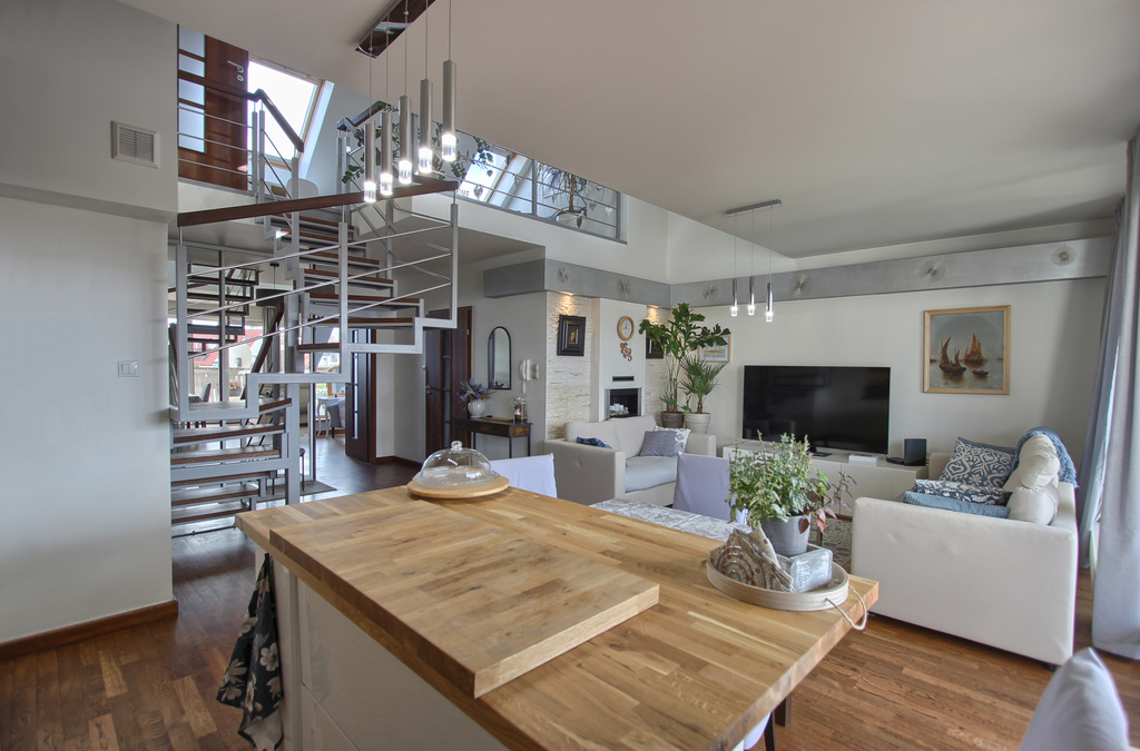 Podłogi drewniane, na górze wykładzina. W salonie biokominek.