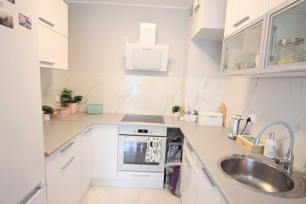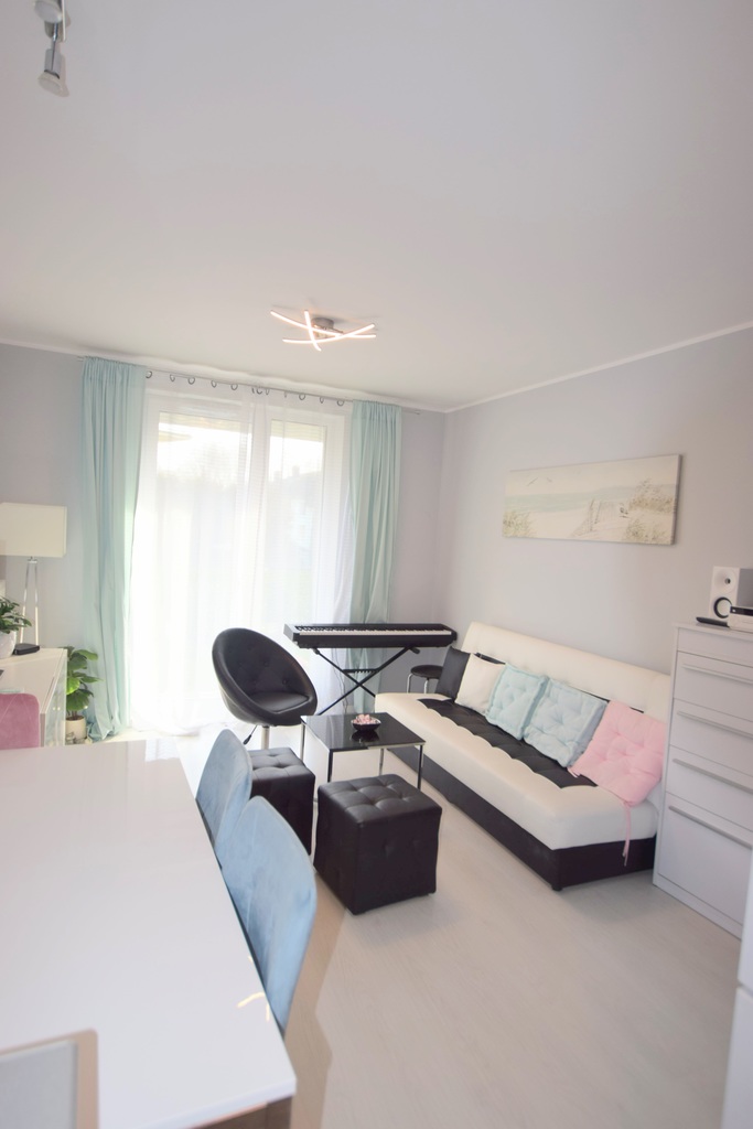 Salon z aneksem kuchenny 17,5 m2. Na podłodze panele, w kuchni terakota, ściany gładkie. Kuchnia w zabudowie z meblami na wysoki połysk. Kuchnia wraz ze sprzętem w cenie.