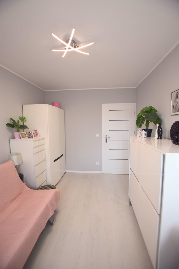Sypialnia ponad 10m2, ustawna, na podłogach panele ściany gładkie.