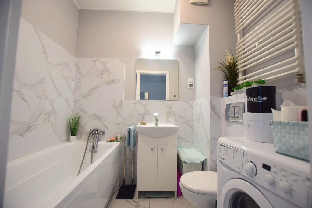 Łazienka z dużą wanną, geberitem w jasnej przyjemnej kolorystyce.