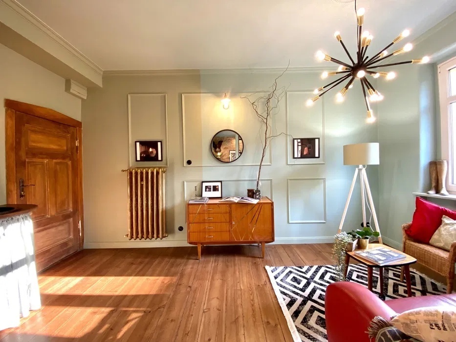 Oryginalne drewniane podłogi i drzwi, odnowione.