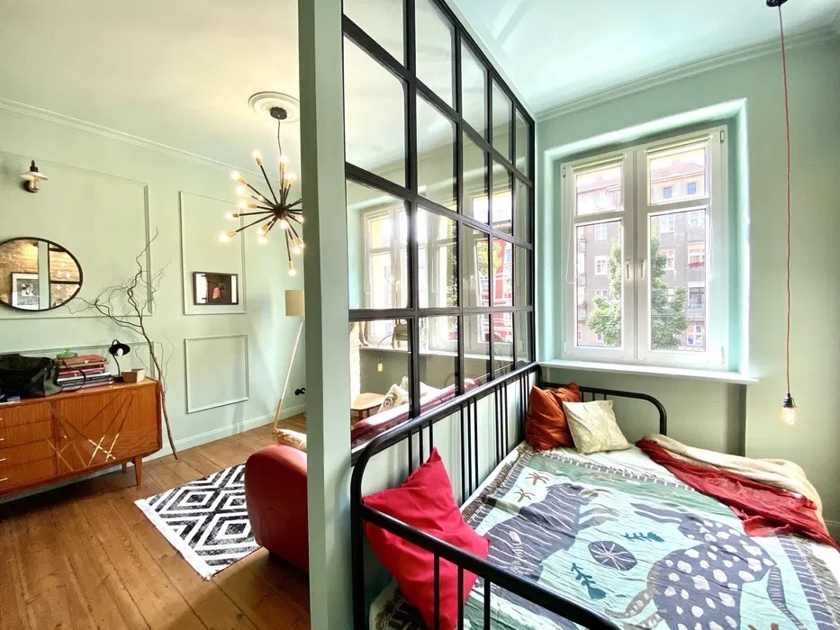 Apartament z aneksem kuchennym i łazienką, sypialnią, kuchenką indukcyjną, pralką, nową lodówką retro pod kolor oraz nietuzinkowym, przemyślanym wyposażeniem.