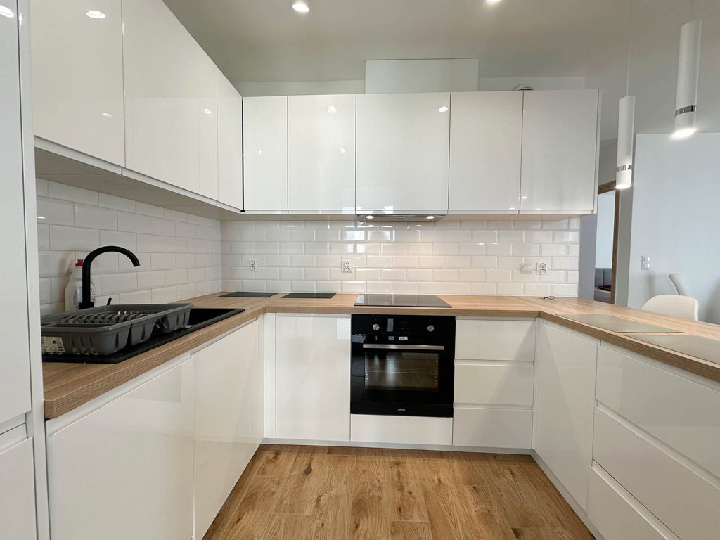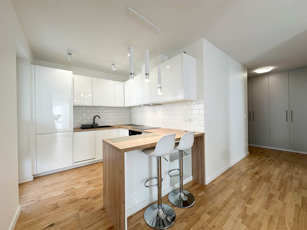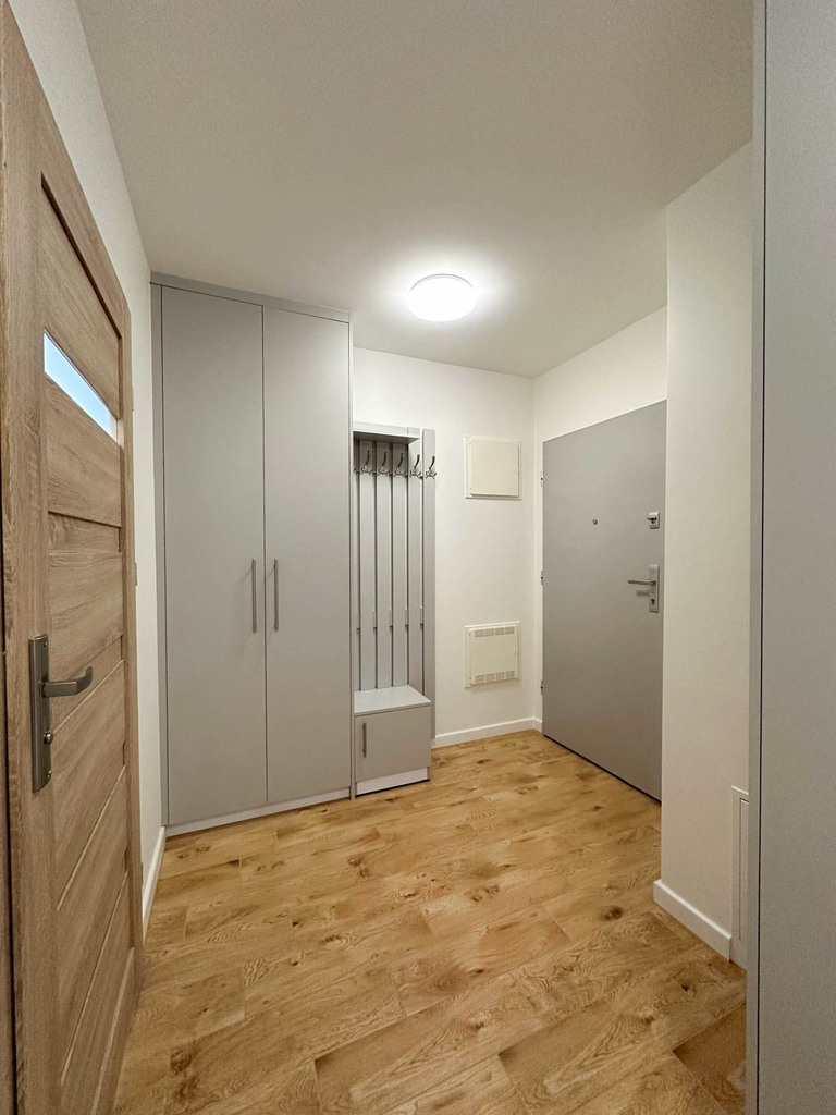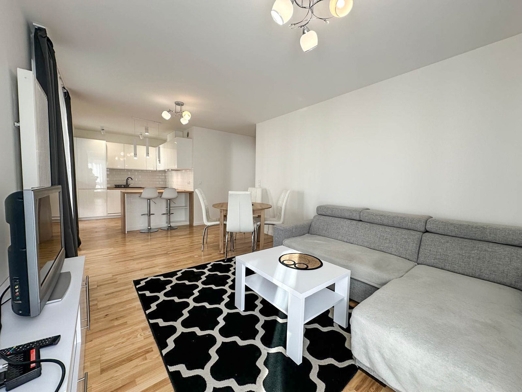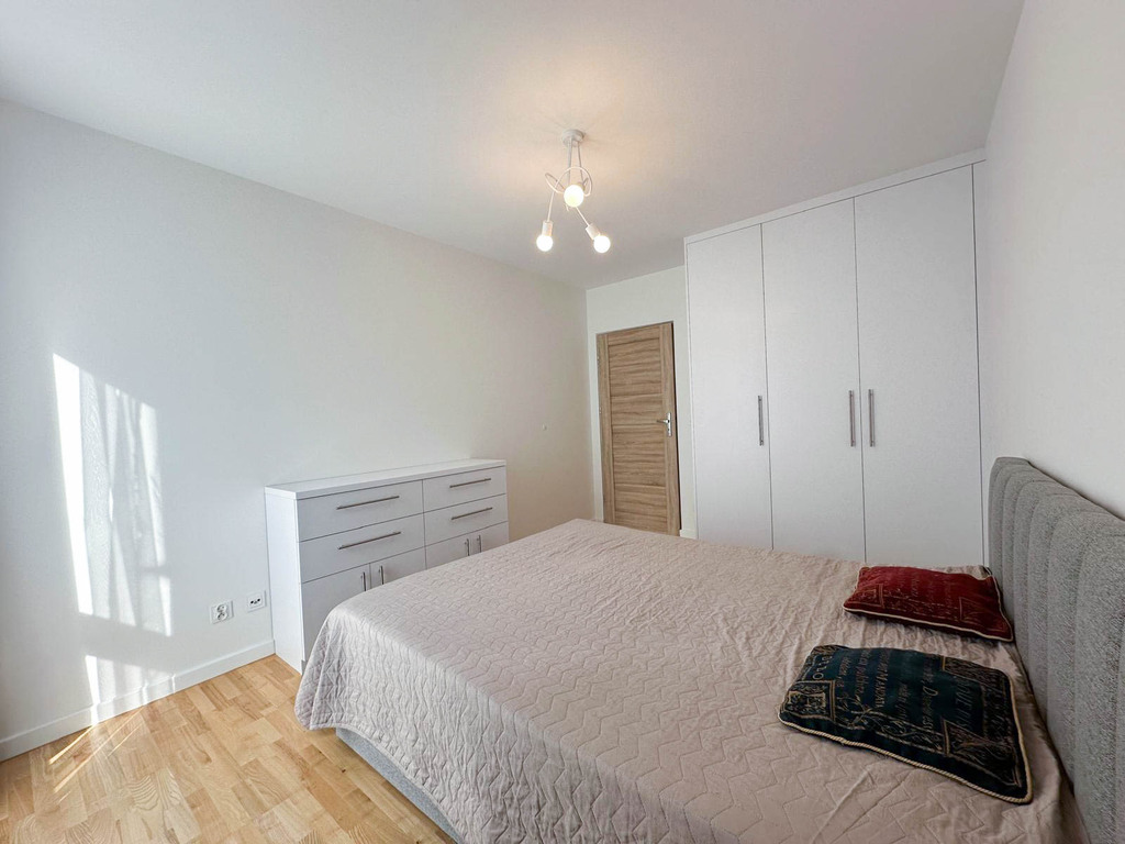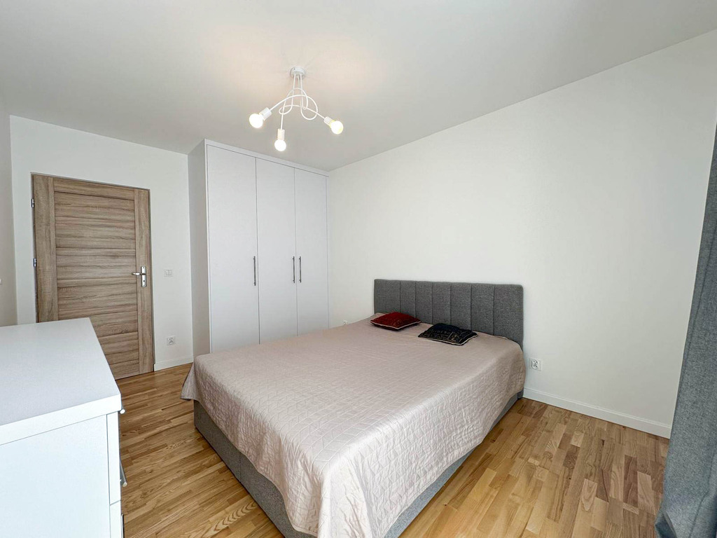 Kuchnia wyposażona w meble w zabudowie wraz z nowym sprzętem AGD (piekarnik, lodówka, płyta indukcyjna, zlewozmywak) oraz blat jadalniany wraz z hokerami. Wydzielona została również część jadalniana z rozkładanym stołem oraz krzesłami idealnie współgrającymi z pozostałym wyposażeniem. W salonie duża sofa, szafka pod TV, telewizor oraz ława. Z salonu wyjście na duży taras. Ustawna sypialnia na wyposażeniu której znajduje się łóżko sypialniane, duża szafa w zabudowie oraz komoda. Łazienka wyposażona w wannę, umywalkę, WC, pralkę. Na korytarzu duża szafa w zabudowie.