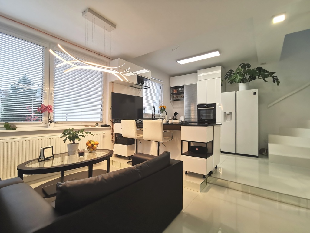 - salon z aneksem kuchennym w pełni wyposażony w nowe sprzęty na gwarancji