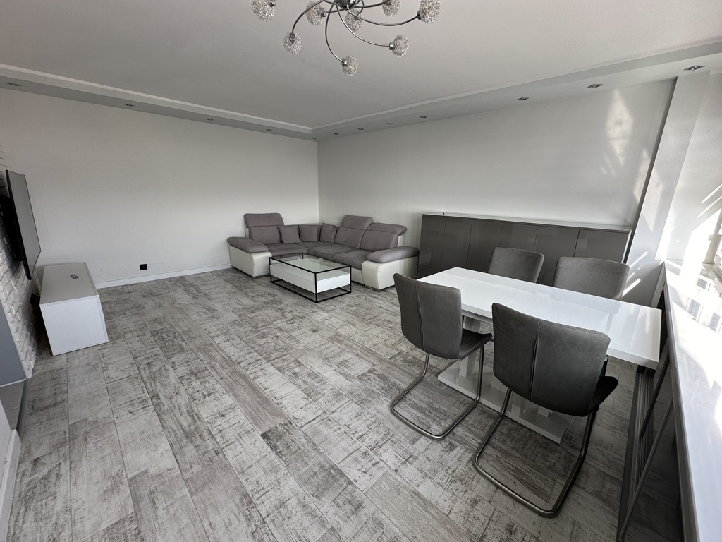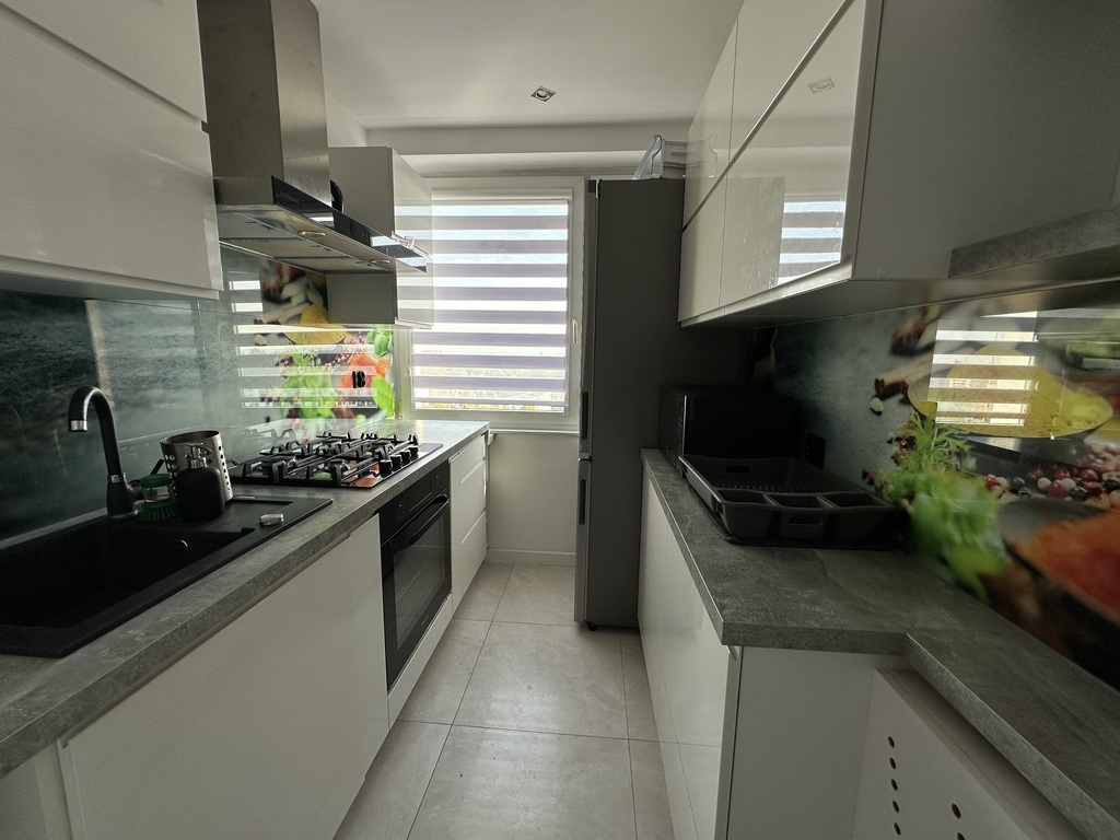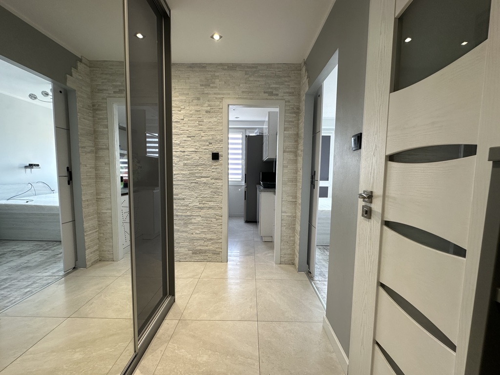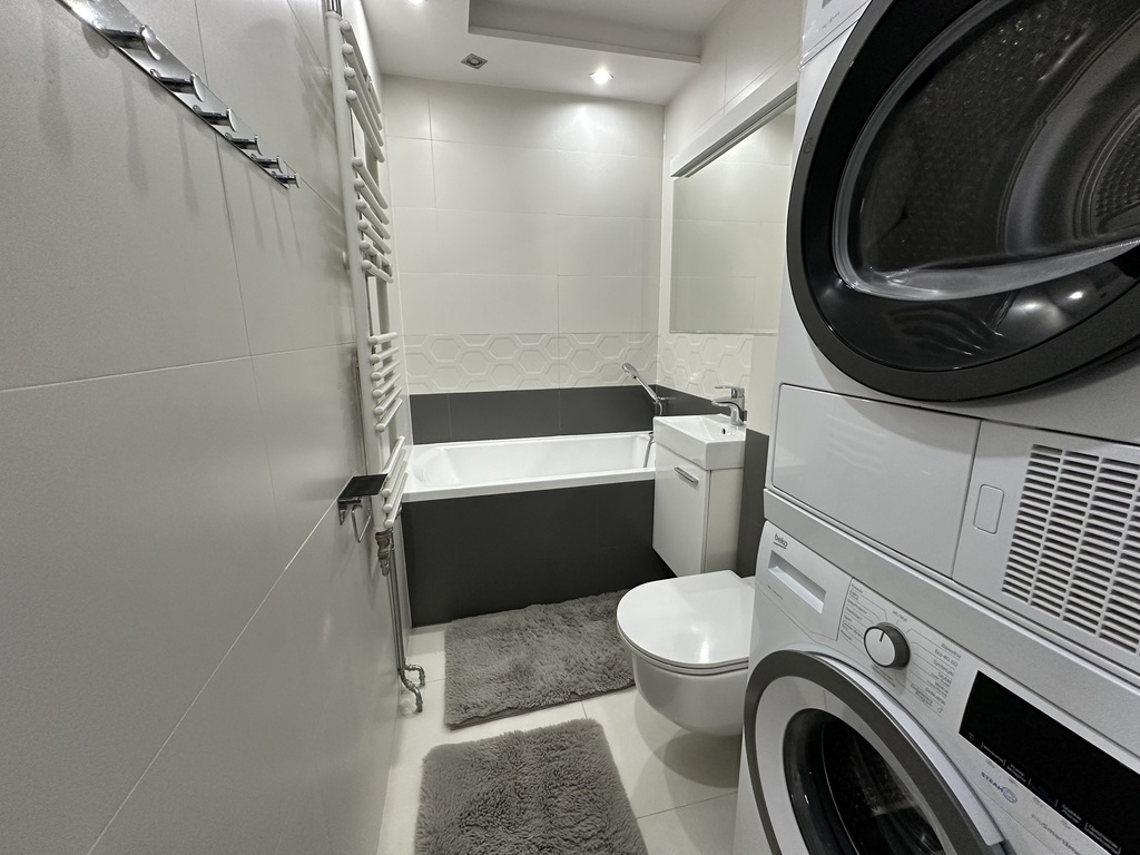 Salon 24m2 wyposażony w narożnik, ławę, stół z krzesłami, komodę, szafkę RTV i telewizor. Sypialnia 9m2 z balkonem francuskim z dużym łóżkiem i komodą. Kuchnia 4m2 z meblami w zabudowie, lodówką z zamrażarką, kuchenką, piekarnikiem i mikrofalówką. Łazienka 3.5m2 z wanną, pralką i suszarką. Przedpokój 5.5m2 również w pełni wyposażony, w tym w pojemną szafę.