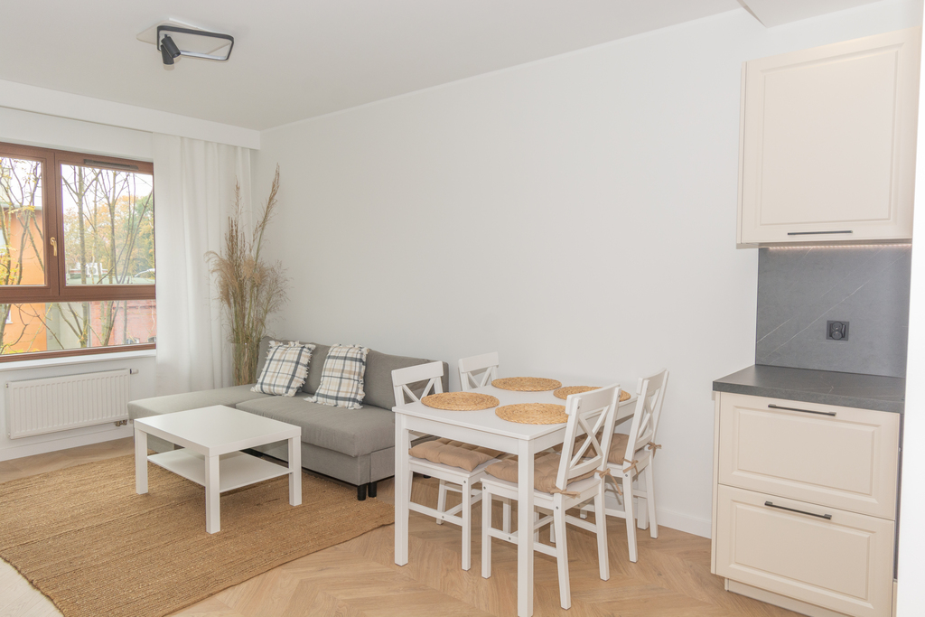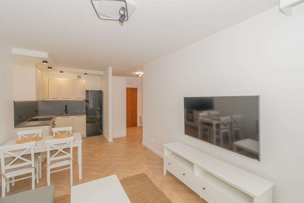 - salonu z rozkładanym narożnikiem, telewizorem, stołem z 4 krzesłami oraz aneksu kuchennego wyposażonego w zabudowę meblową, piekarnik, okap, lodówko-zamrażarkę, zmywarkę