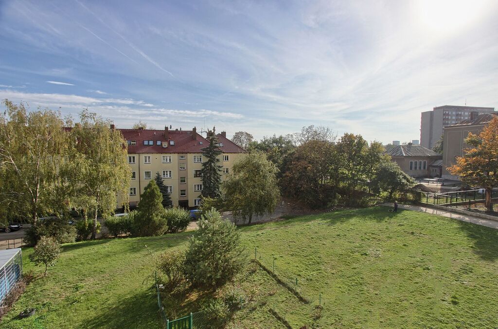 Mieszkanie mieści się na drugim piętrze dziesięciopiętrowego budynku. Okna od strony południowej, z widokiem na zieleń.