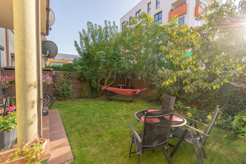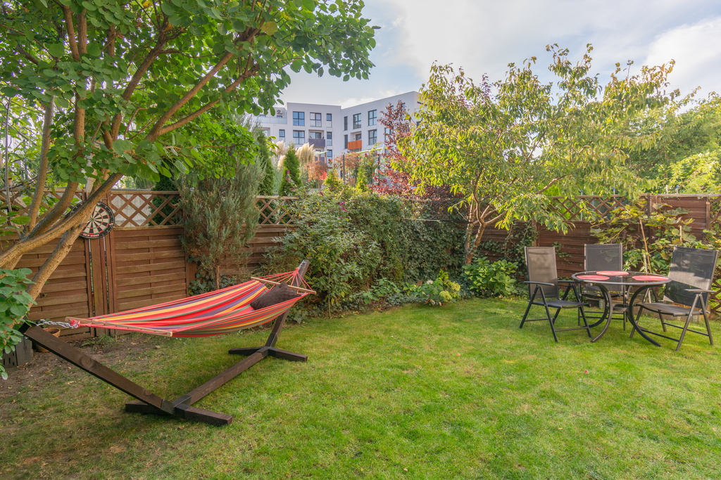 W ogrodzie drewniany domek na narzędzia, woda i prąd. Dodatkowo zamontowany zbiornik na deszczówkę o pojemności 100 litrów. Drzewo czereśni z pysznymi dużymi owocami umili letnie chwile w ogrodzie.