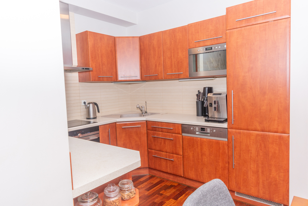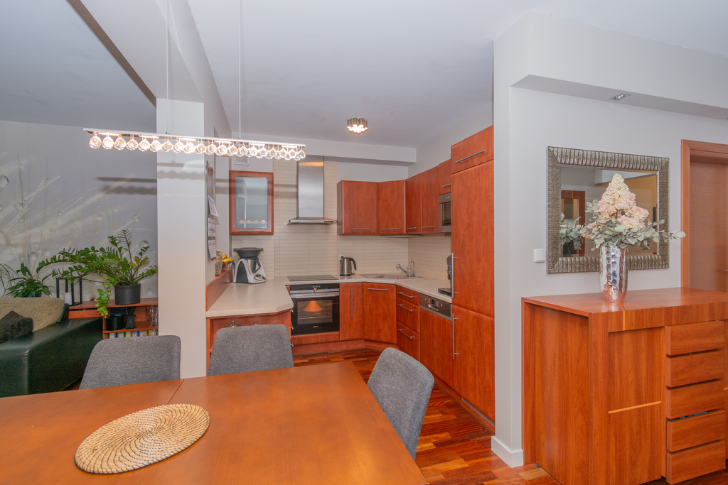 Kuchnia w zabudowie z płytą indukcyjną, piekarnikiem, lodówko-zamrażarką, okapem, mikrofalówką i wodą z filtra odwróconej osmozy.