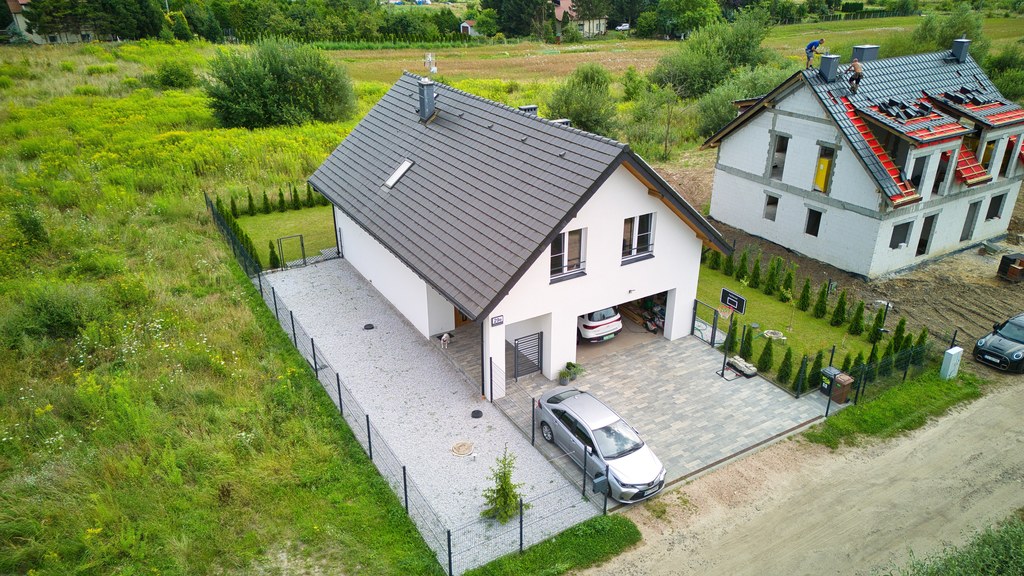 Dom wybudowany w 2021 r. materiał budowlany cegła, dach pokryty dachówką.