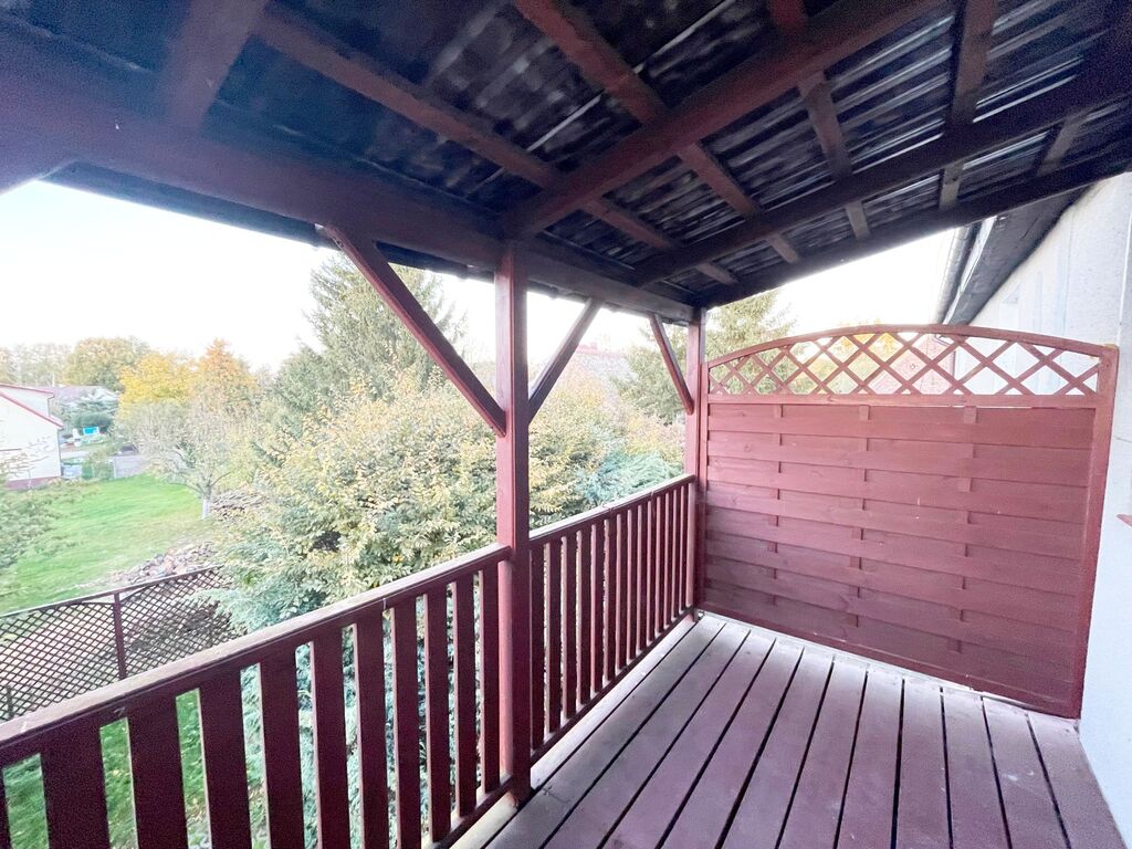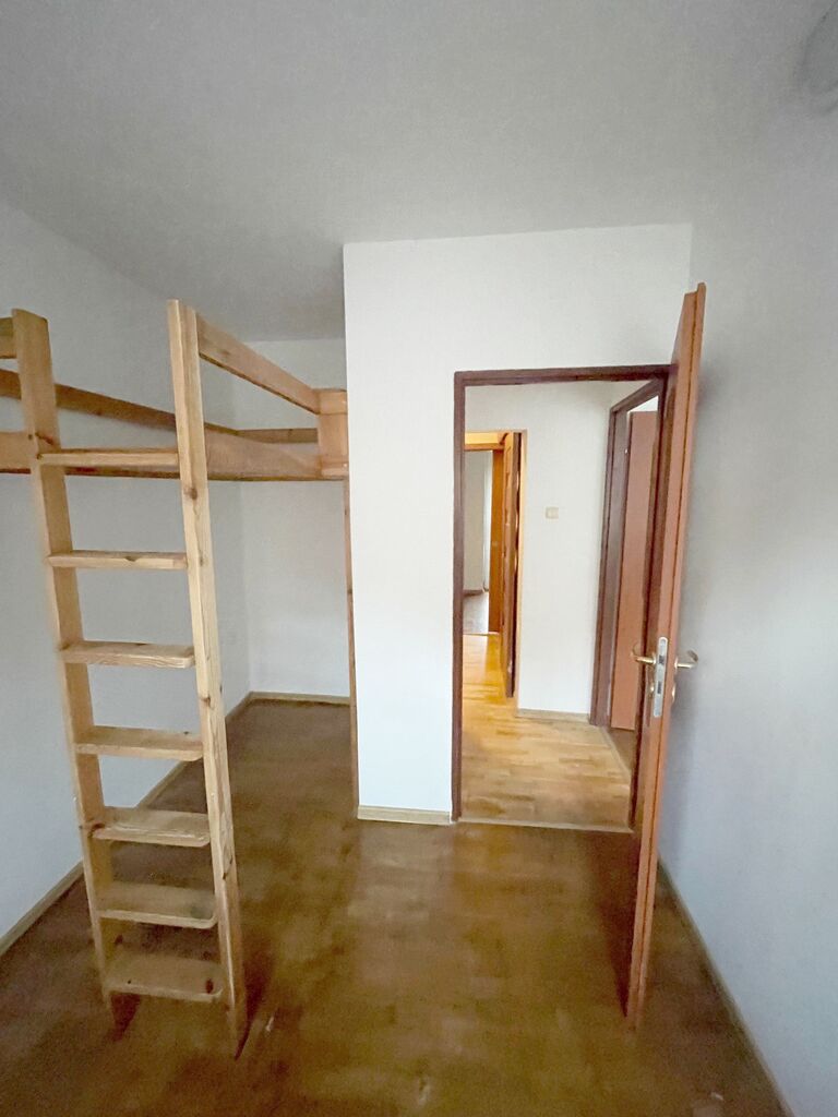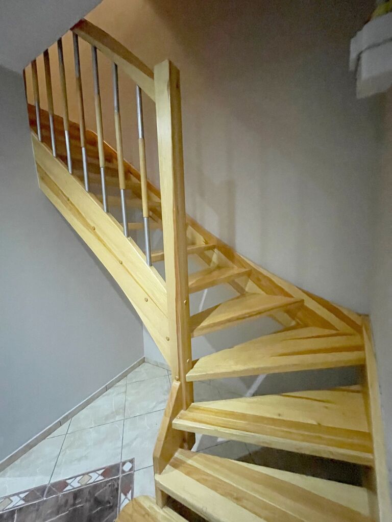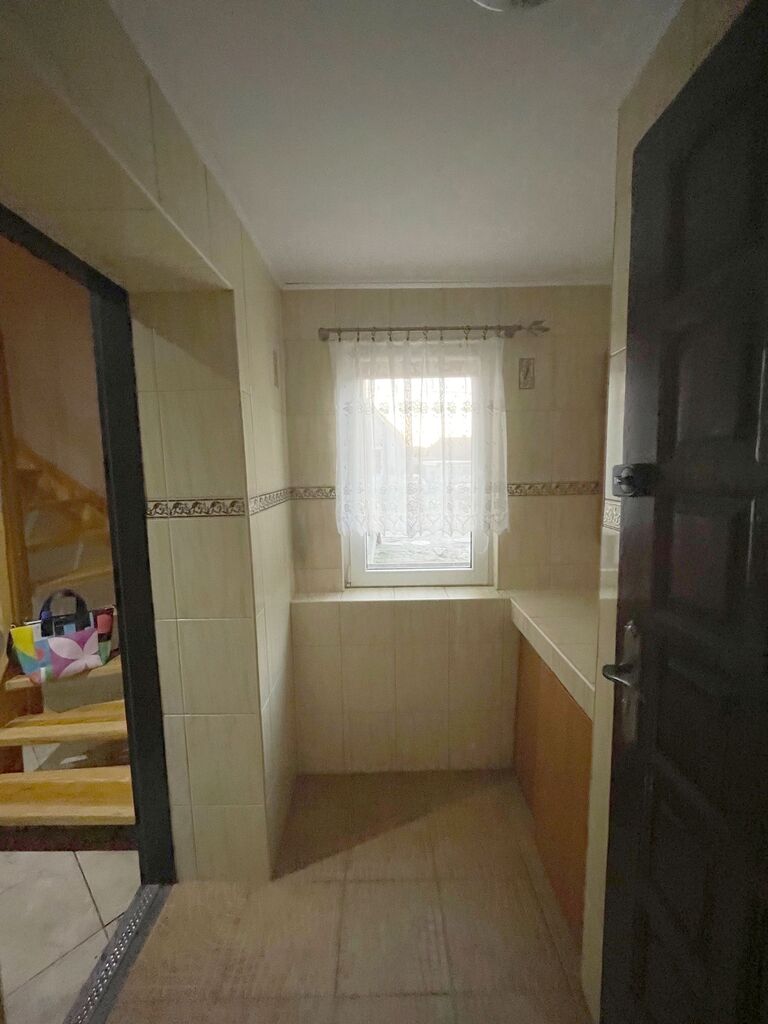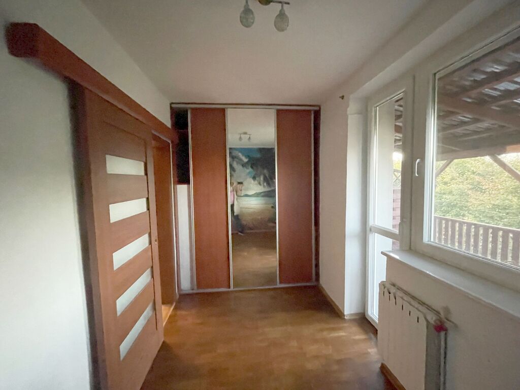 Na pierwszym piętrze do którego prowadzą drewniane schody znajduje się korytarz , 3 nieduże pokoje ( pierwotnie były 2 pokoje, można wrócić do stanu pierwotnego), łazienka z prysznicem. Z jednego pokoju wyjście na dużą werandę. Ściany w mieszkaniu gładzone i malowane, okna PCV, na podłogach panele, instalacji elektryczna miedziana.