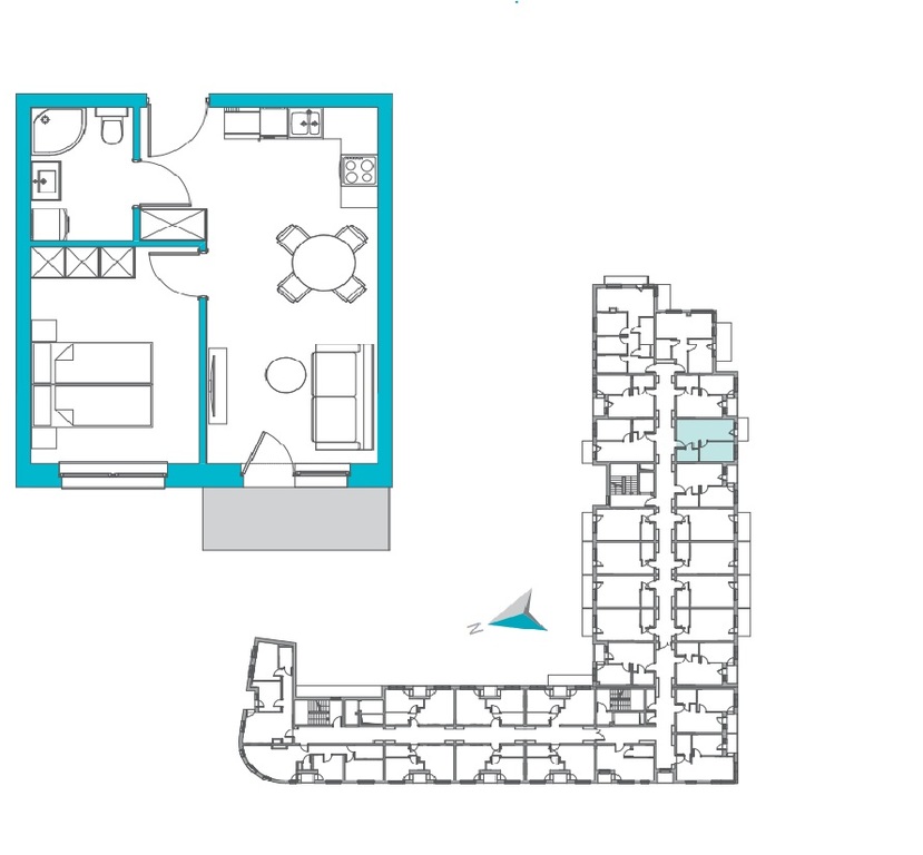 Mieszkanie 2 pokojowe, na II piętrze, składa się z salonu dziennego z aneksem kuchennym i przedpokojem, sypialni, łazienki, balkonu i komórki lokatorskiej.