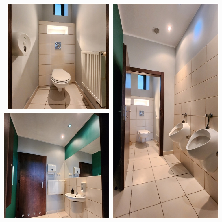Na pierwszym znajdują się sale dla gości, toalety, oraz zaplecze kuchenne z pomieszczeniami gospodarczymi.