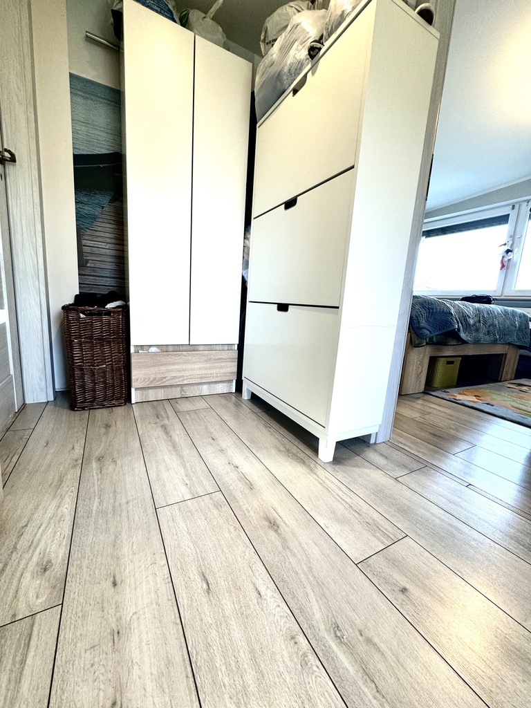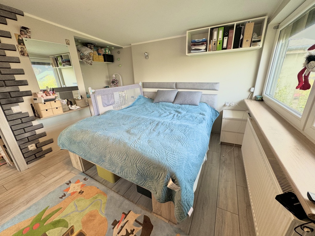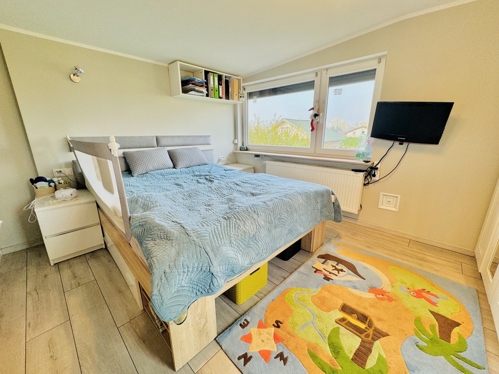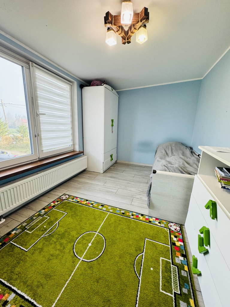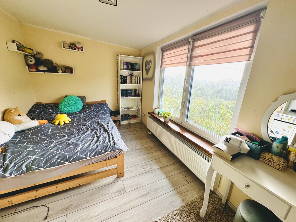 Na piętrze znajdują się trzy sypialnie. Okna PCV (3 szyby), rolety zewnętrzne (w jednej sypialni).