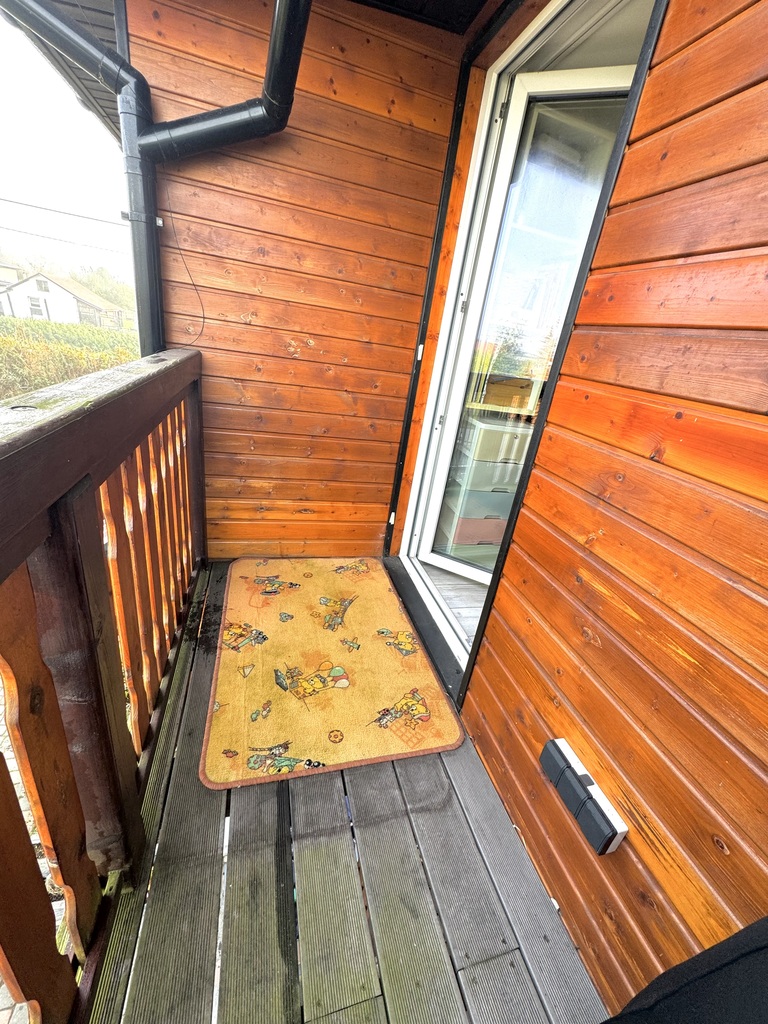 Do domu przylega zadaszony taras oraz niewielki balkon.