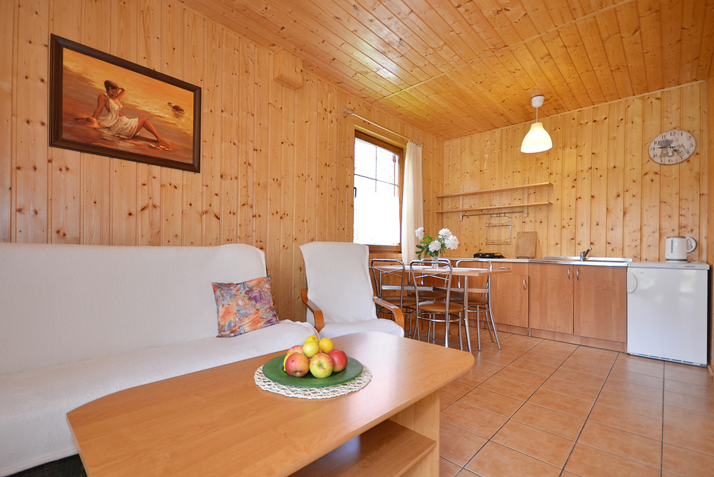 Każdy apartament wyposażony jest w telewizor 32’’, ławostół na tarasie, grill, leżaki, parawan.
