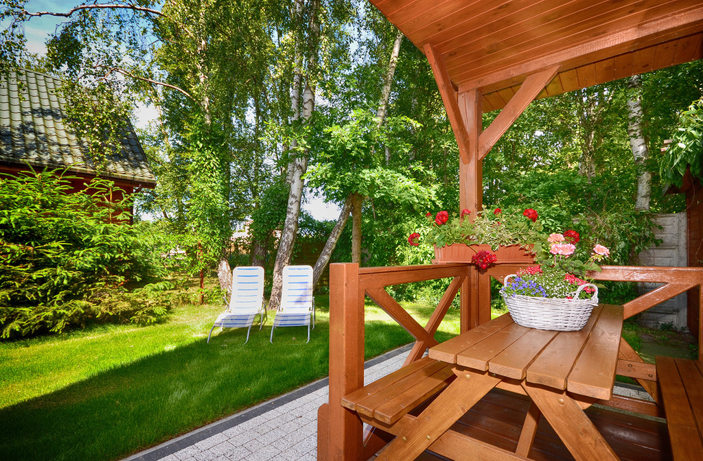 Każdy dom ma wyodrębnioną posesję z indywidualnym ogródkiem, są od siebie oddalone szpalerem iglaków. Odległość między domkami wynosi około 4 m, co daje poczucie intymności i komfortu.