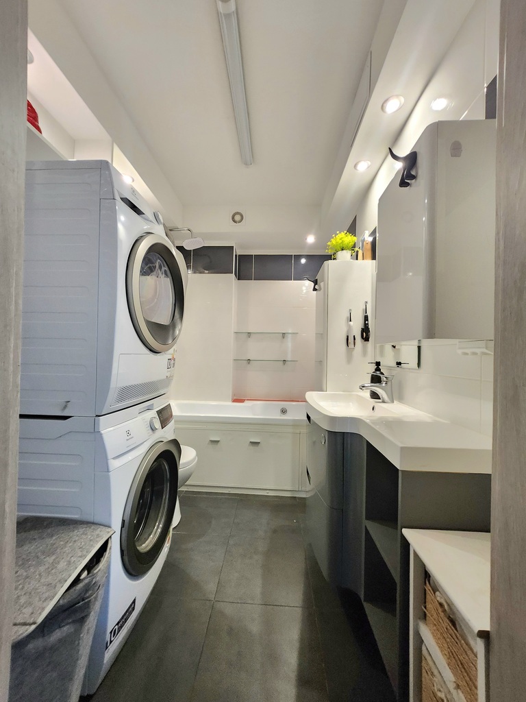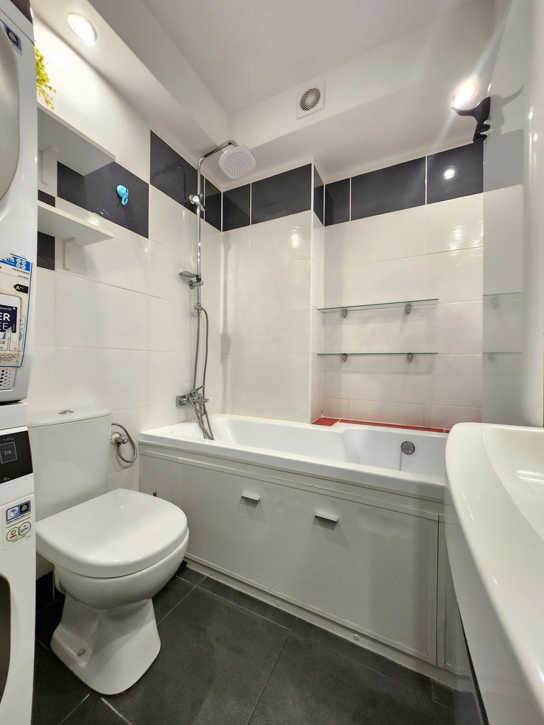 Mieszkanie zaaranżowane w przyjemny sposób z licznymi meblami w zabudowie.