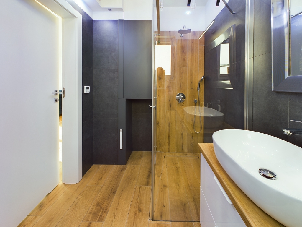 łazienka wyposażona WC oraz dużą kabiną prysznicową
